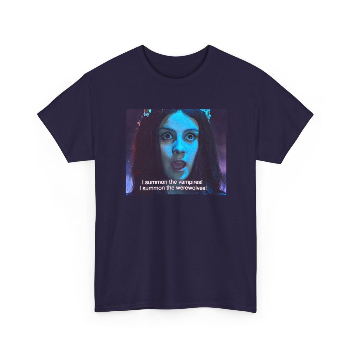 This t-shirt showcases an iconic scene that blends the mystical with the macabre, featuring a witch girl who calls forth vampires and werewolves. Its captivating design not only pays homage to cult classic cinema but also adds a unique flair to any outfit. Moreover, the vibrant graphic print creates a conversation starter wherever you go, making it an essential addition to your collection.
