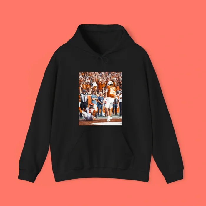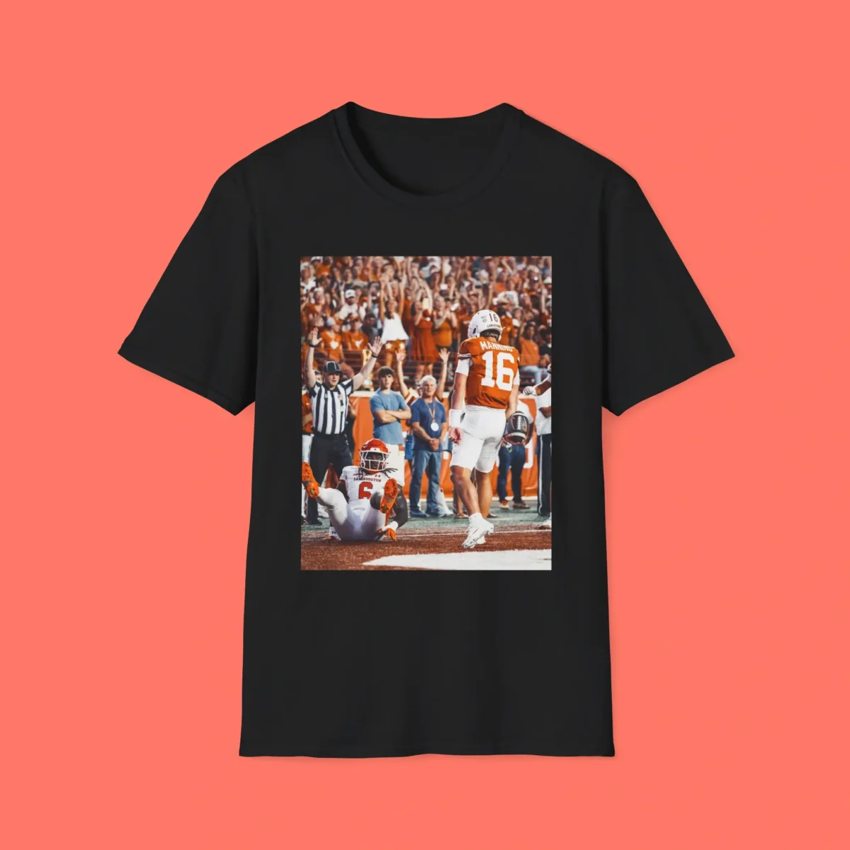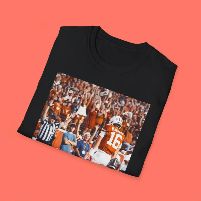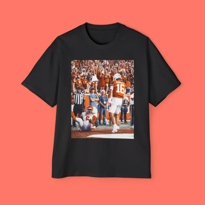 This standout shirt features an iconic graphic of Arch Manning in his signature burnt orange No. 16 jersey, showcasing him amidst a sea of excitement as he delivers that unforgettable stare down against a Sam Houston defender. This design encapsulates the essence of the game—confidence, skill, and a touch of swagger. It’s a powerful reminder that football legends are made not just in the stats but in moments that resonate with fans.
