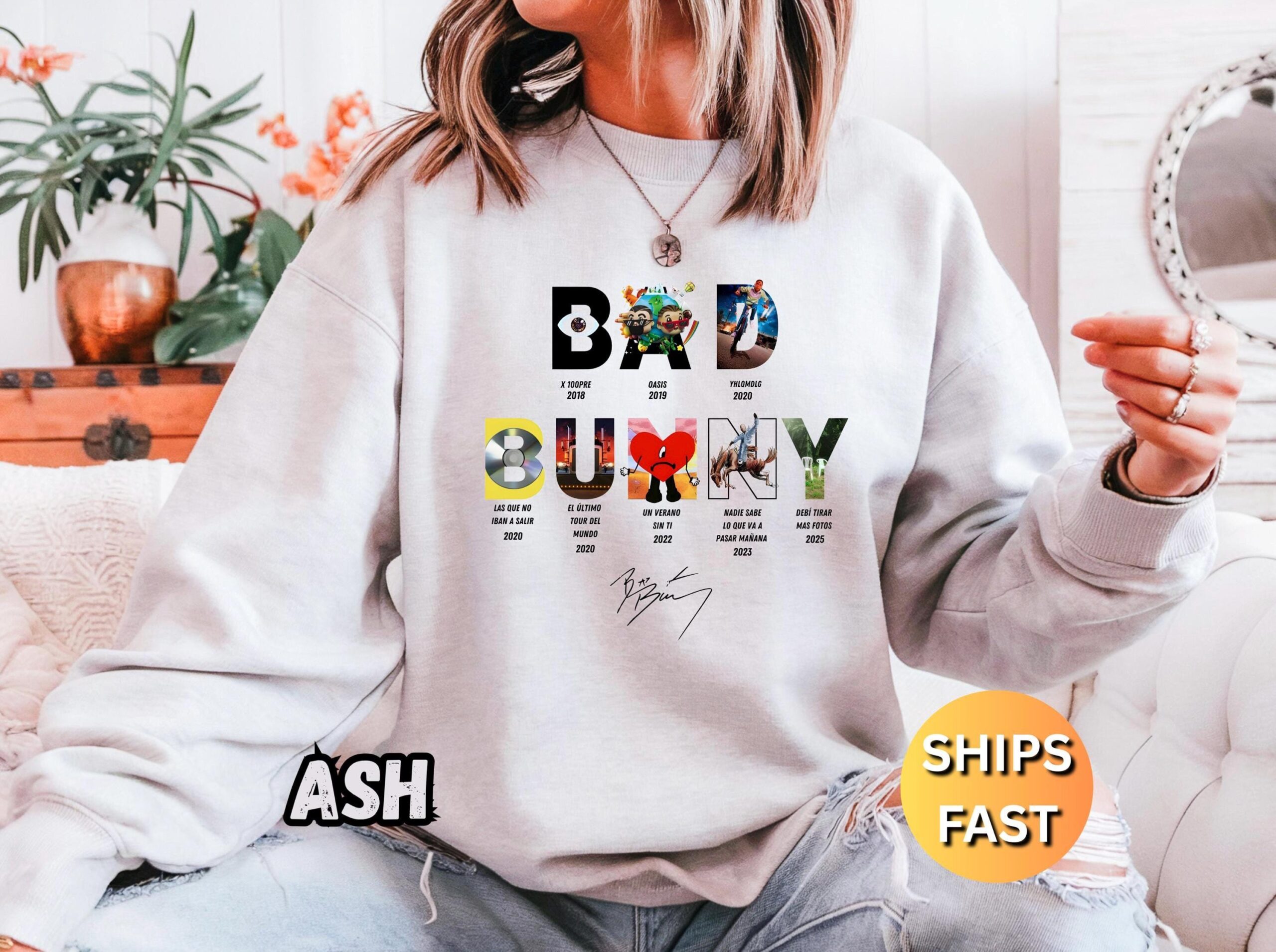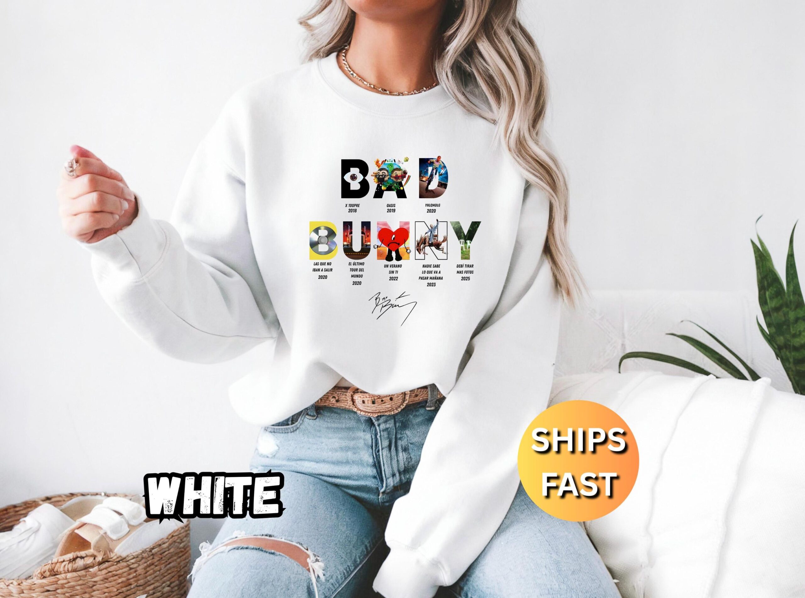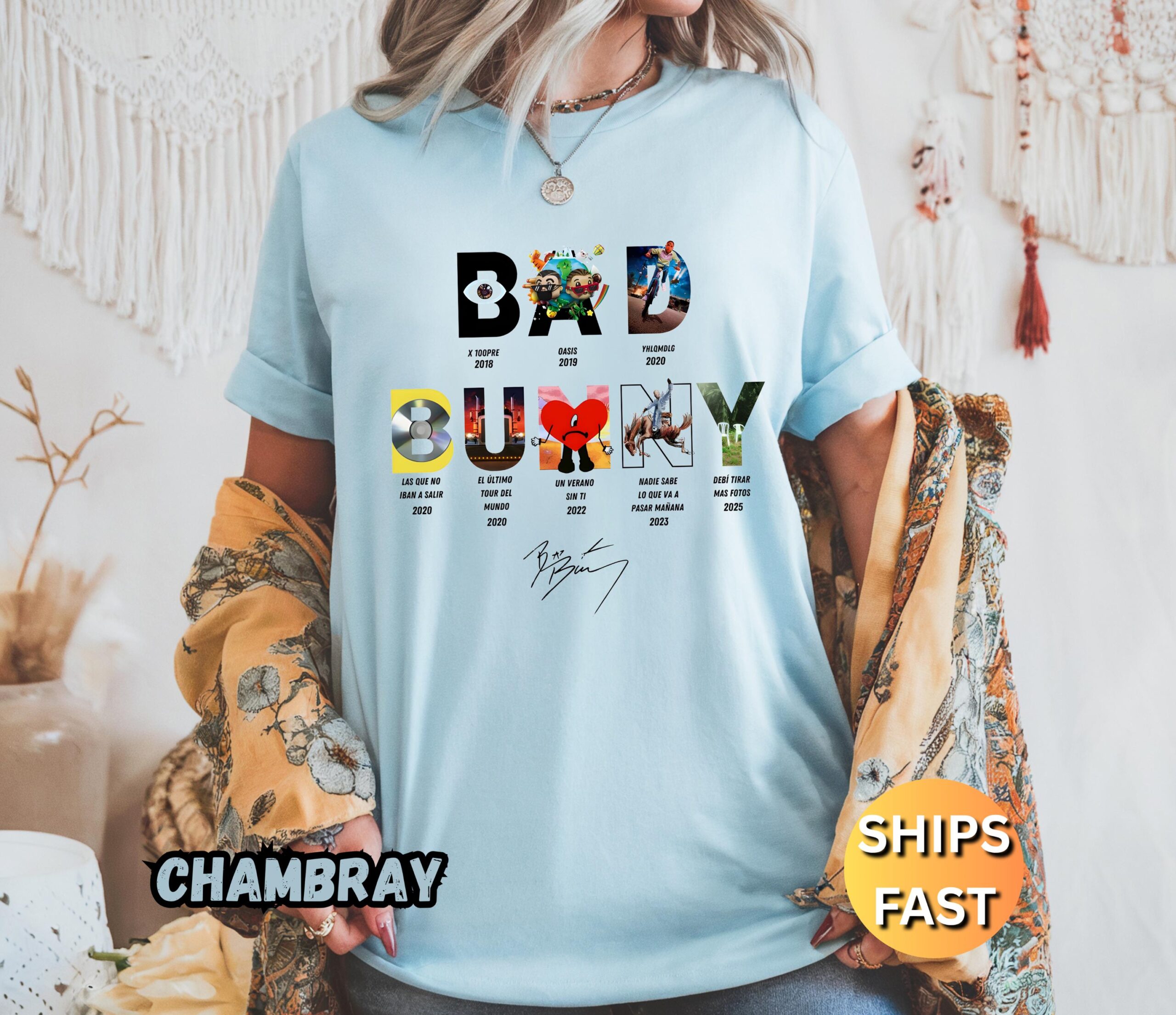 • Bold graphic design that showcases your Bad Bunny fandom.