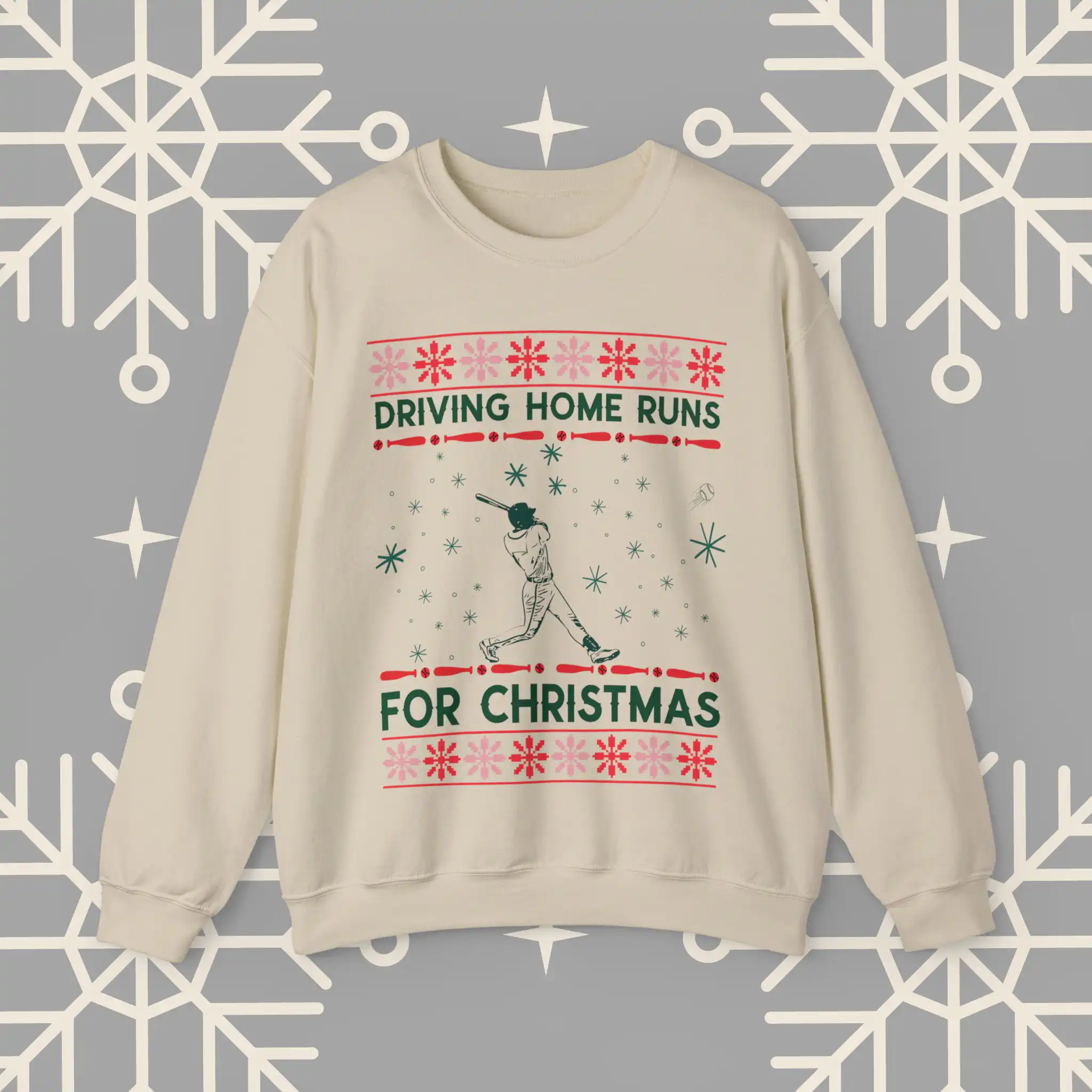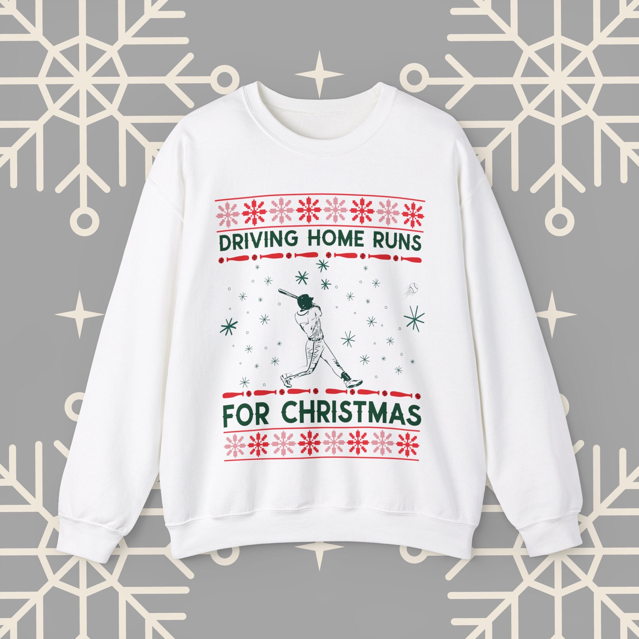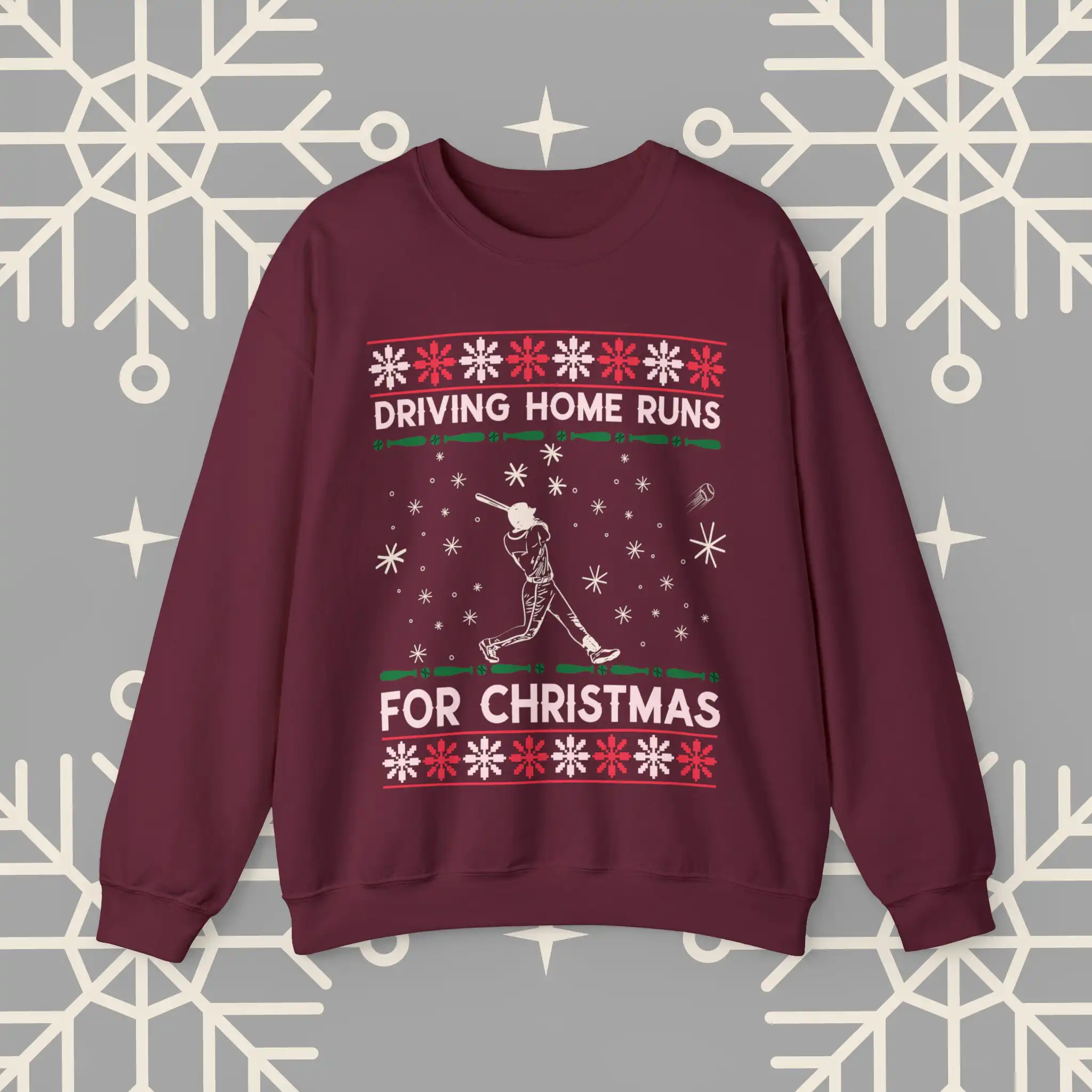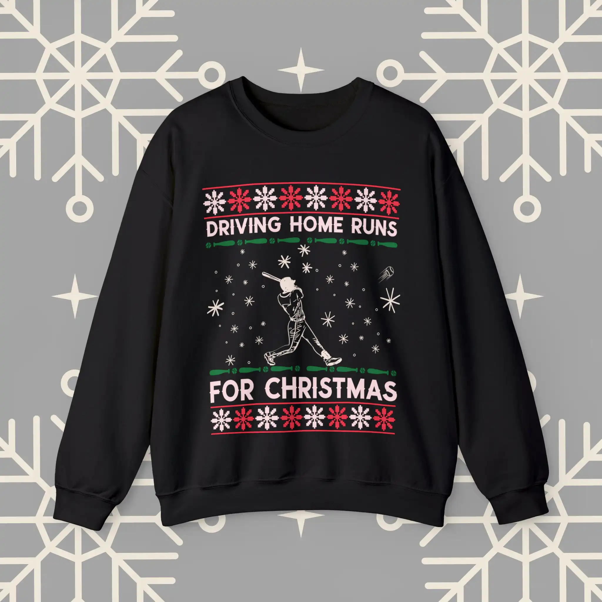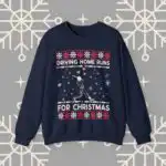 Designed with a fun and catchy “Driving Home Runs for Christmas” graphic, this sweatshirt adds a unique twist to traditional holiday wear. The bold design captures the excitement of the game while keeping the festive spirit alive, ensuring you stand out at any ugly Christmas sweater party. Moreover, its unisex fit makes it an ideal choice for everyone, whether you’re hitting the baseball field or gathering around the tree with family.