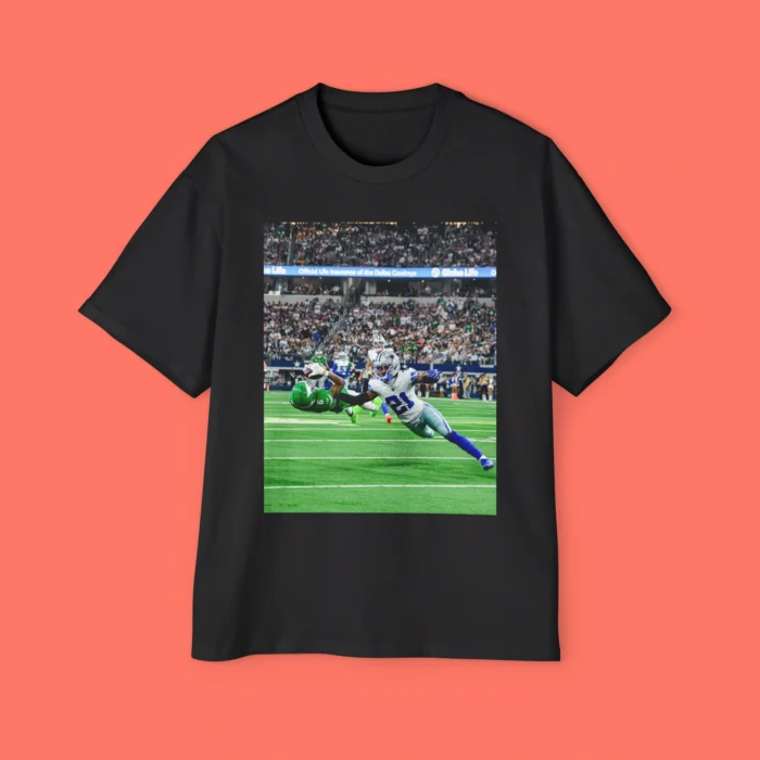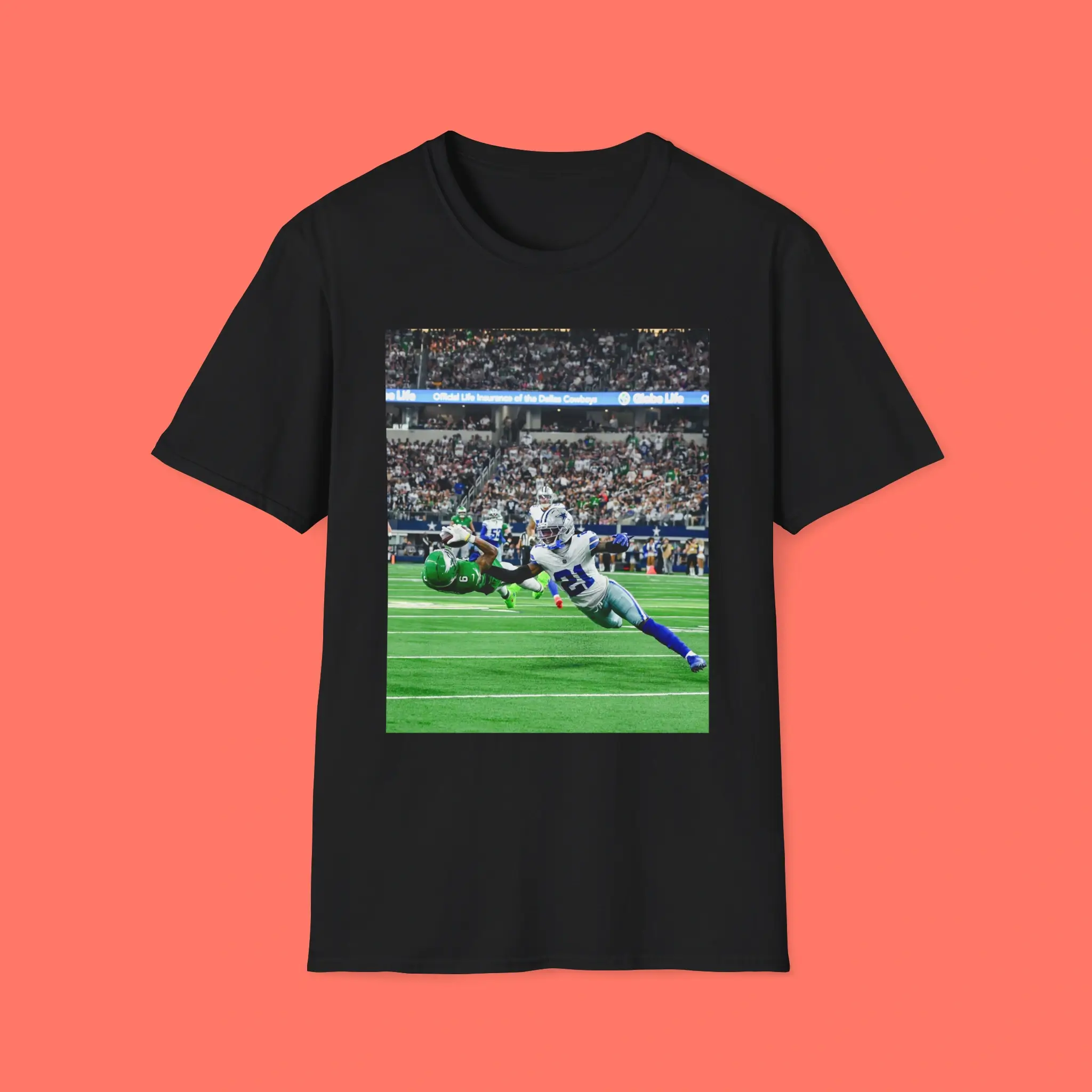 The design features Smith in mid-air, reaching for that unforgettable reception, with a Cowboys defender trailing closely behind. This dynamic scene is enhanced by vivid stadium lights and a cheering crowd, making it feel alive and energetic. With such a bold graphic, this shirt serves as a wearable tribute to one of the season’s standout plays.