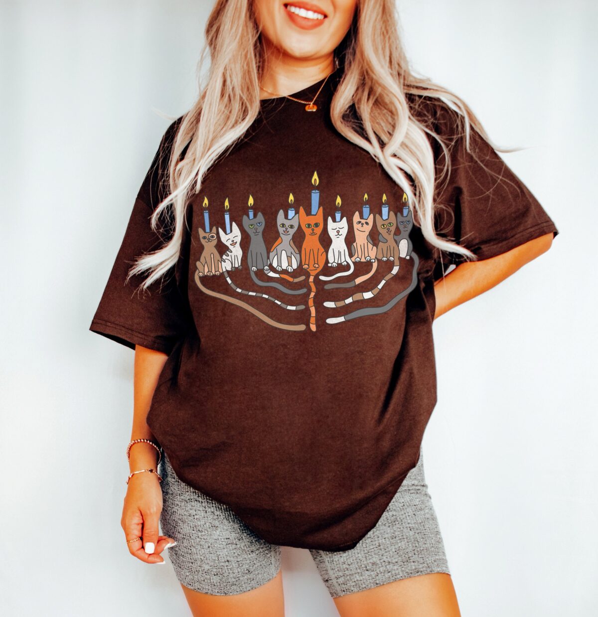This shirt is not just for Hanukkah; it’s perfect for any casual outing or relaxed get-together. Imagine wearing this unique piece while sharing stories and laughter with loved ones around the menorah or at festive dinners. Additionally, it’s a fantastic way to express your love for both cats and the holiday spirit!