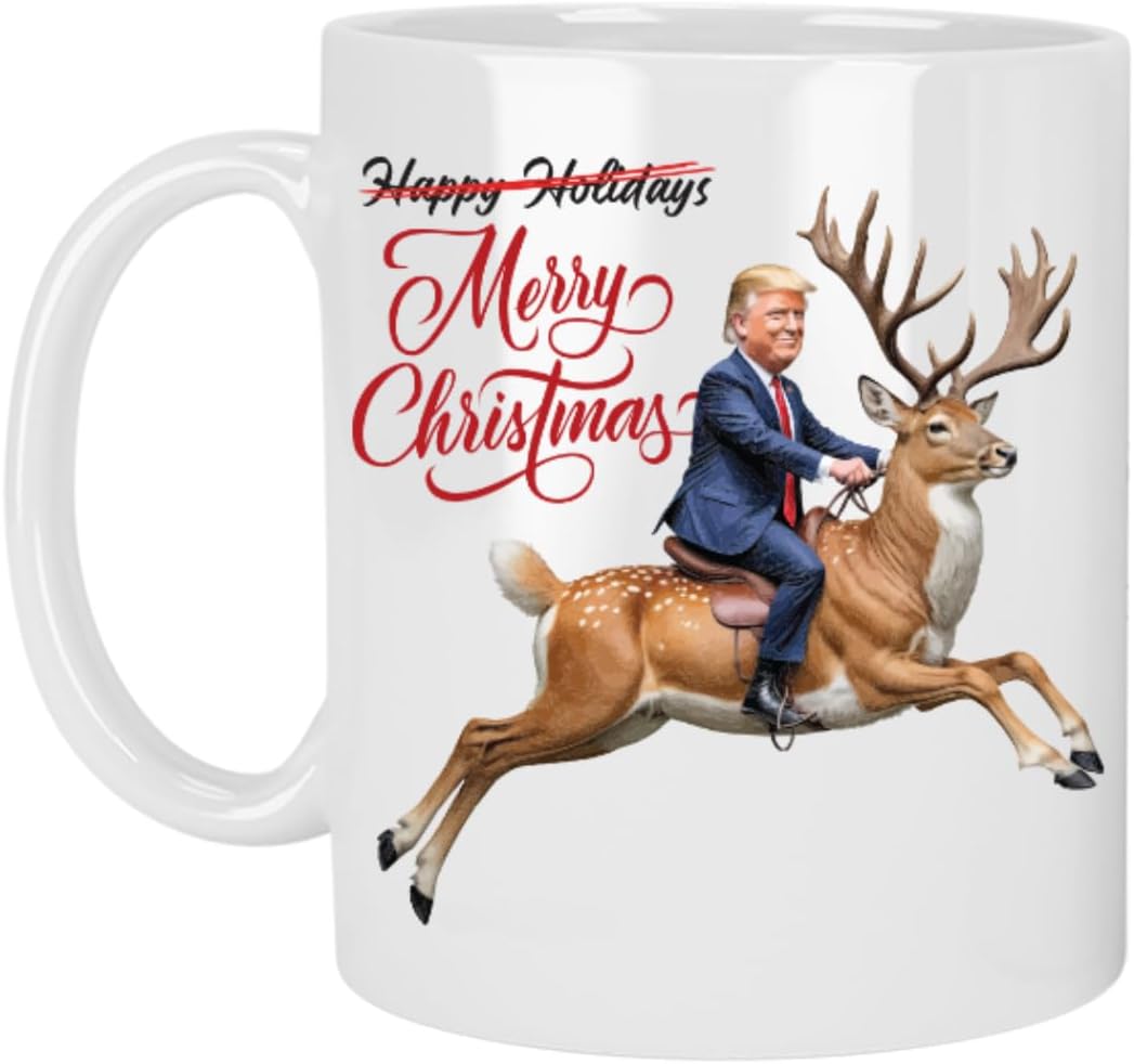 The design of this mug features a whimsical Christmas reindeer and a playful nod to the President of the United States. Its modern, heavy-duty construction ensures it can withstand daily use, while the vibrant graphics are printed on both sides—perfect for left-handed coffee lovers! Moreover, it showcases a unique blend of charm and wit, making each sip a delightful experience.