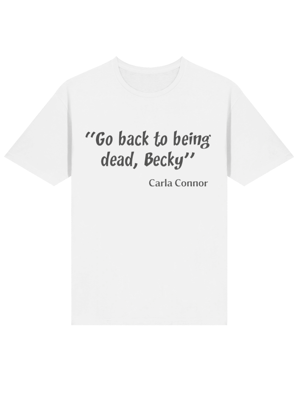 Introducing the Go Back to Being Dead Becky Carla Connor Shirt, a must-have for all fans of Coronation Street! This iconic tee brings one of the sharpest lines from Carla Connor to your wardrobe, blending nostalgia with modern flair.