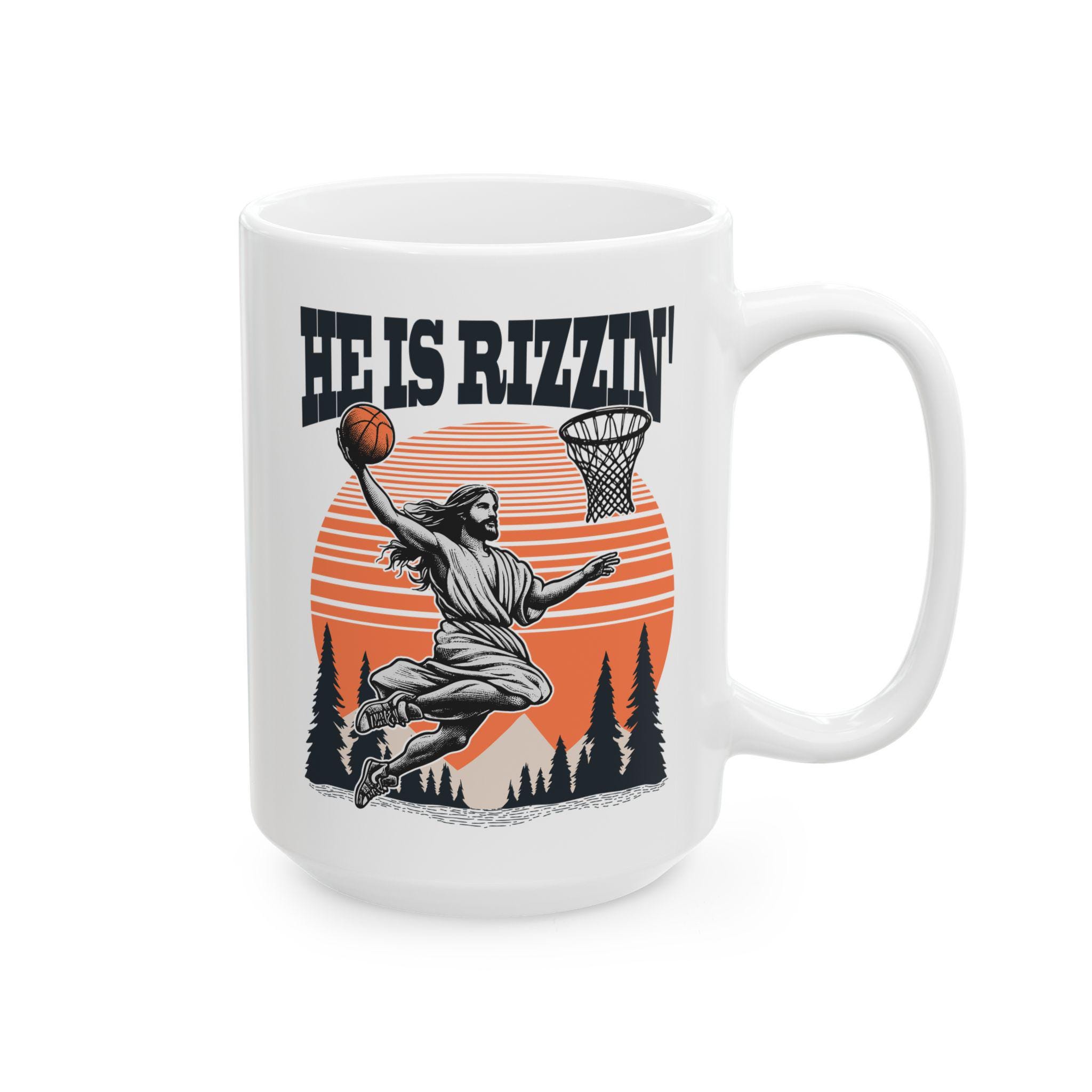 He Is Rizzin Jesus Playing Basketball Mug – Fun Holiday Gift