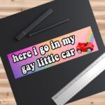 Add a splash of humor to your ride with the “here i go in my gay little car” bumper sticker and magnet! Measuring 8.7” x 2.7”, this waterproof quality sticker is perfect for showcasing your fun personality on any smooth surface. Plus, its vibrant colors and durable design ensure it sticks around for years, making it a perfect conversation starter. Embrace your silly side and let your car express your unique style!
