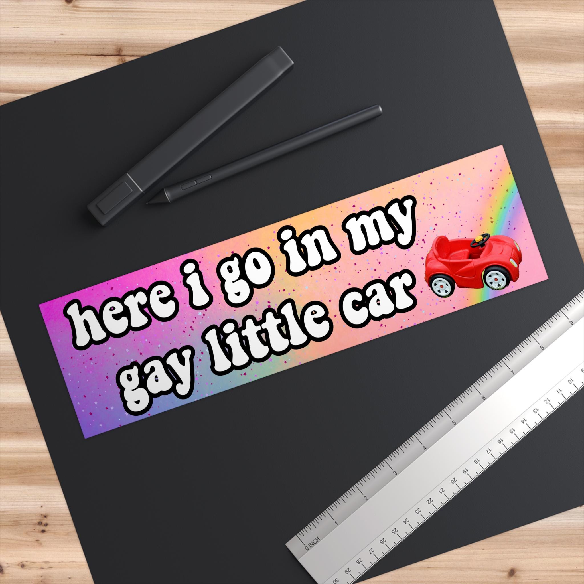 Introducing the here i go in my gay little car | Bumper Sticker & Magnet | Funny Meme Sticker | 8.7” X 2.7” | Waterproof Quality! This playful and vibrant sticker is perfect for anyone looking to add a dash of humor and personality to their car or personal items. Whether you’re cruising down the street or simply want to express your fun side, this sticker is your go-to choice.