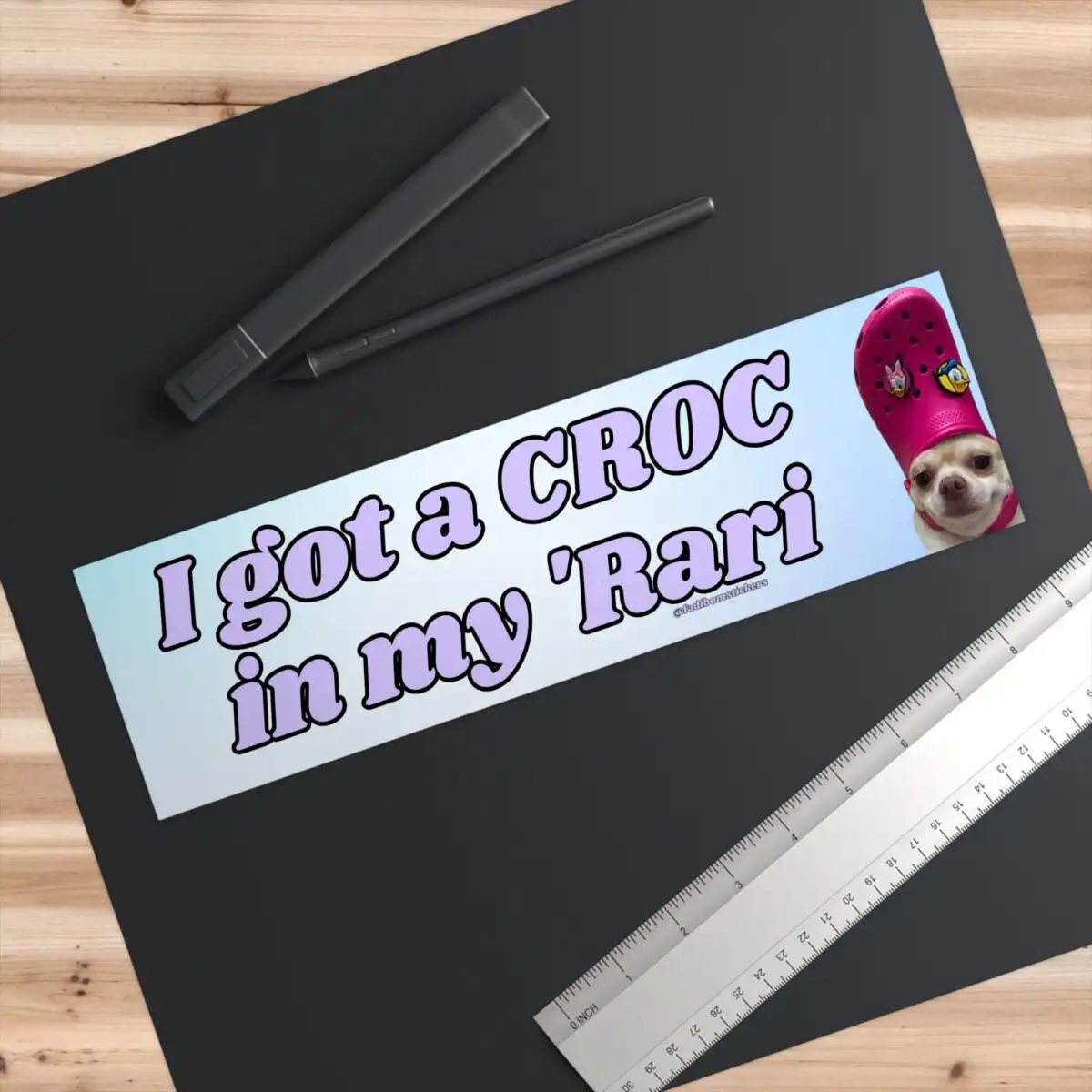 Add some fun to your space with the “I got a croc in my Rari” bumper sticker and magnet! Measuring 8.7” X 2.7”, this waterproof premium quality sticker features a playful meme design perfect for your car, laptop, or any smooth surface. Plus, its durable material ensures vibrant colors that last, making it a great conversation starter and a unique gift for friends and family.