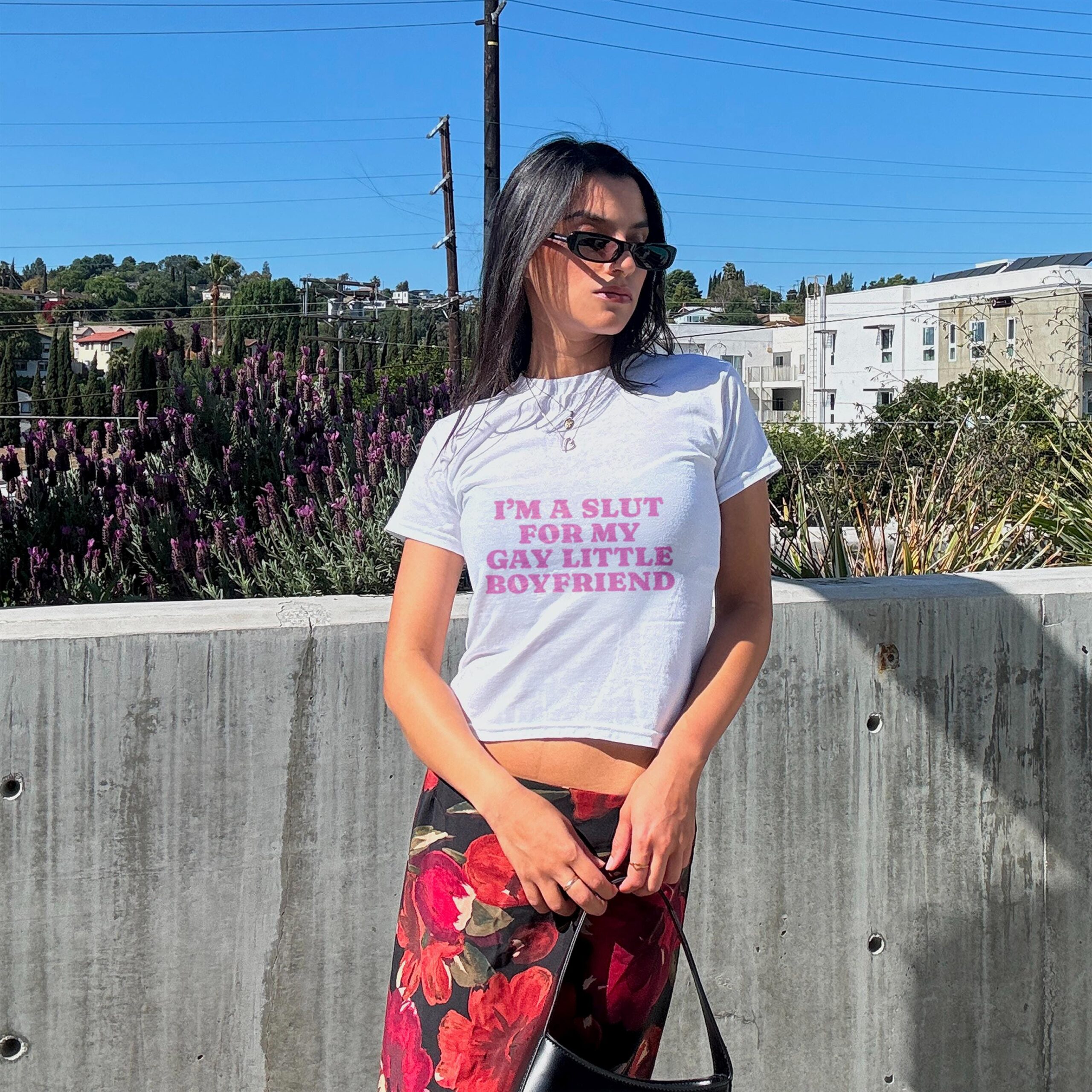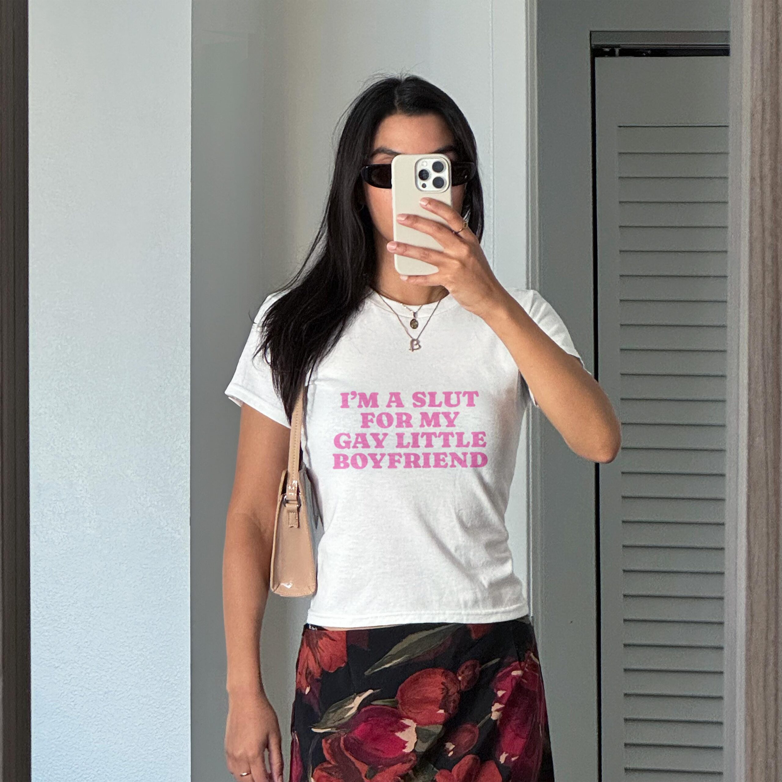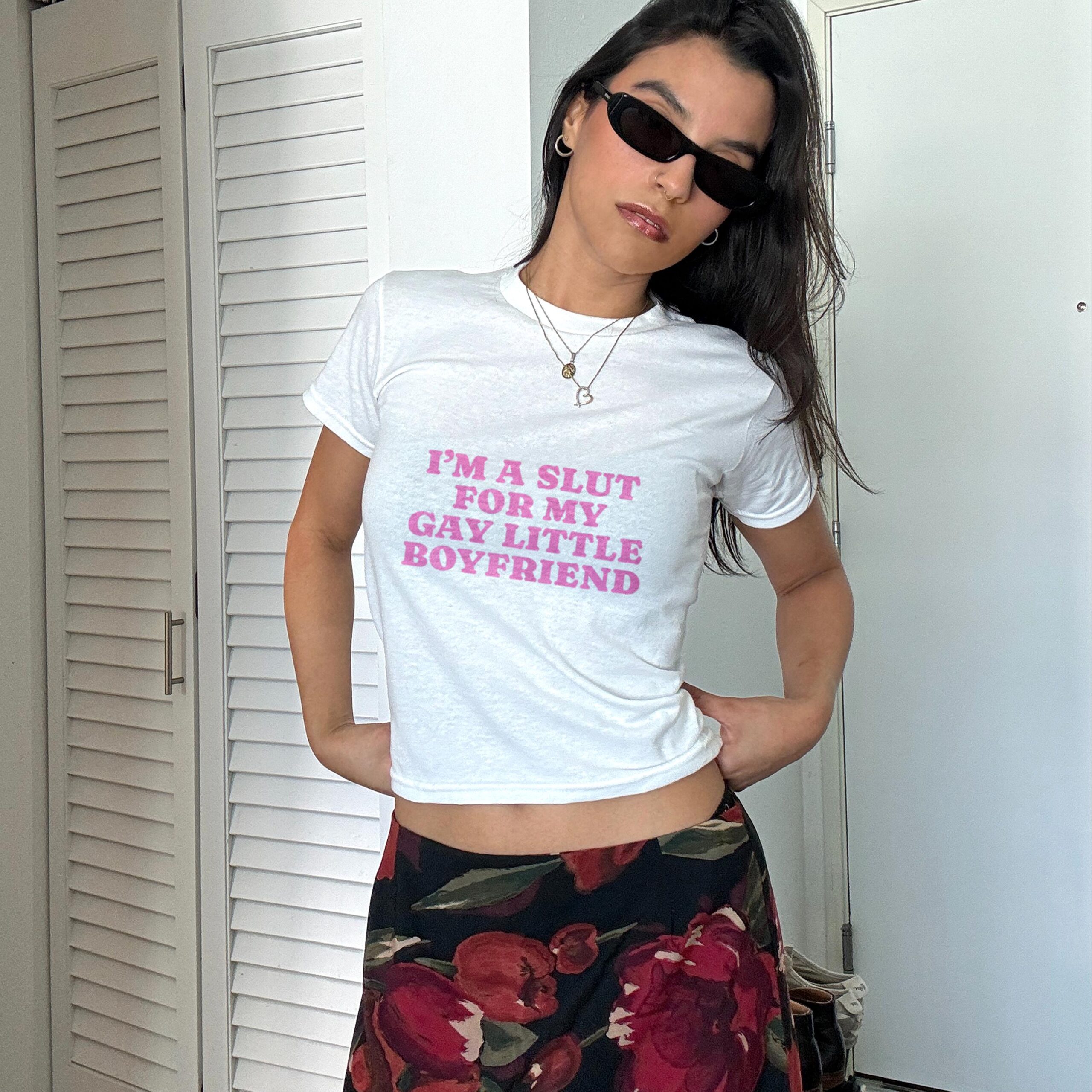 Introducing the I’m A Slut For My Gay Little Boyfriend Baby Tee, a playful and sassy addition to your wardrobe! This Funny Y2K LGBTQ Pride Crop Top is designed for those who embrace their boldness and want to make a statement with a smile. Perfect as a gag gift for your partner, this tee combines humor with heart, making it a must-have for any proud ally or member of the LGBTQ community.