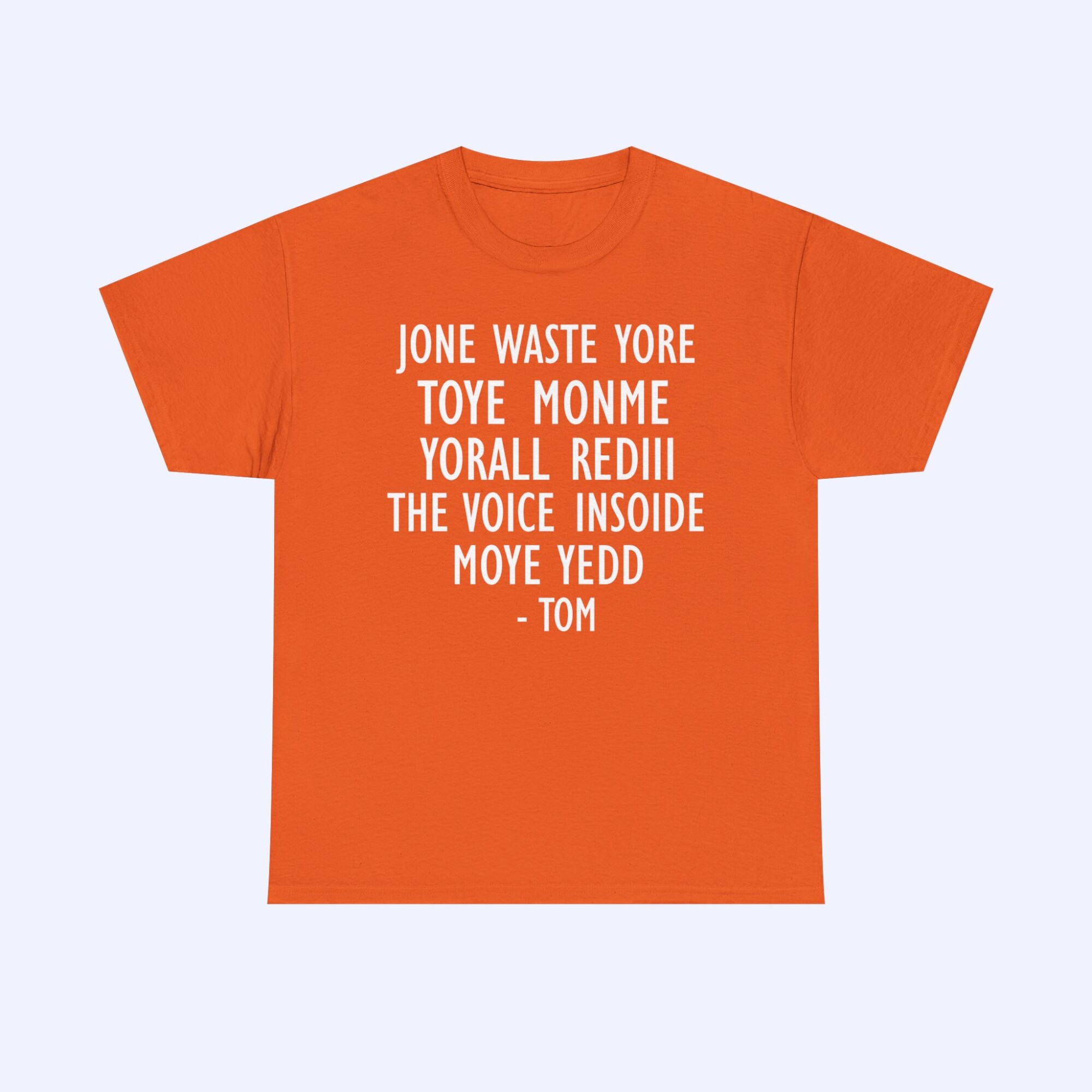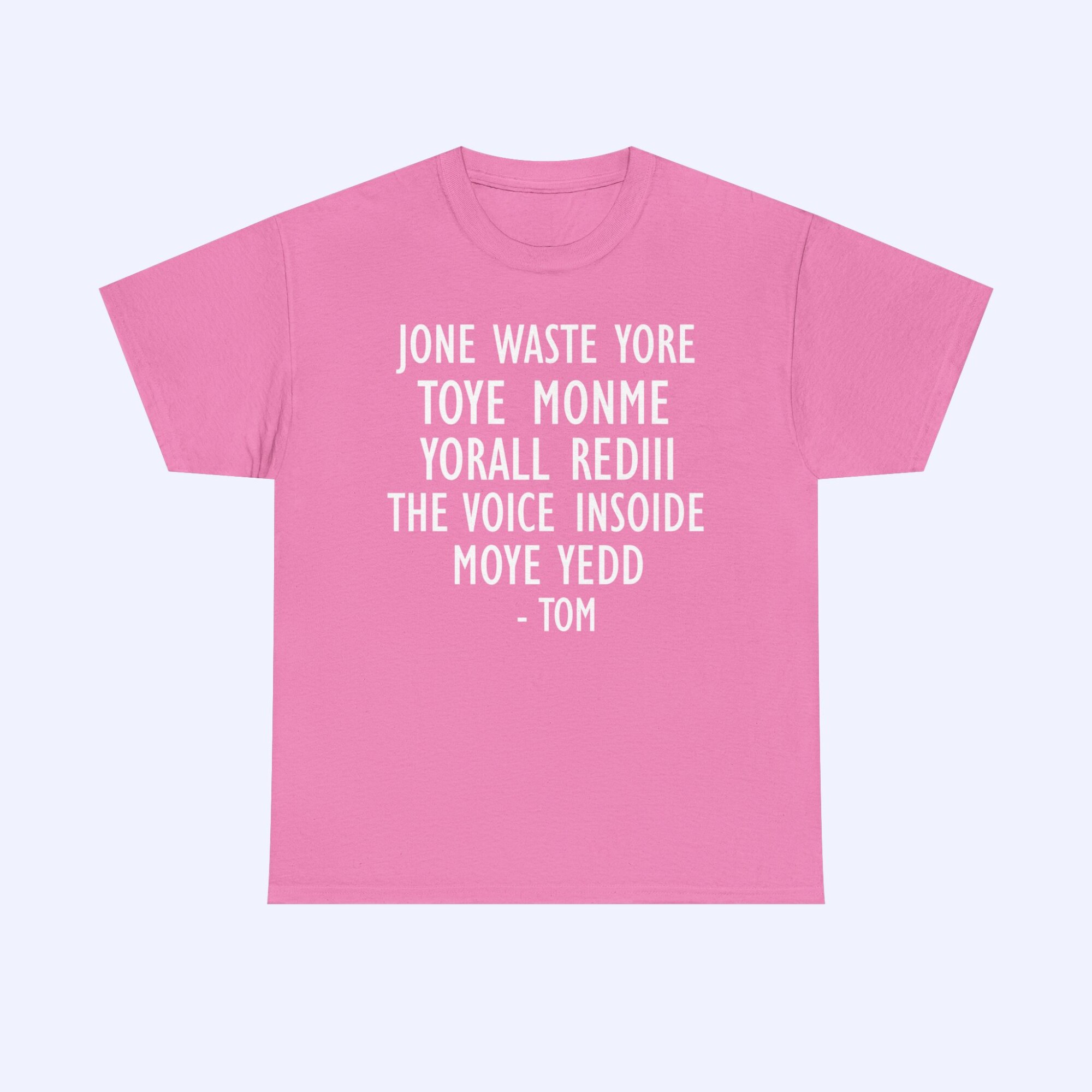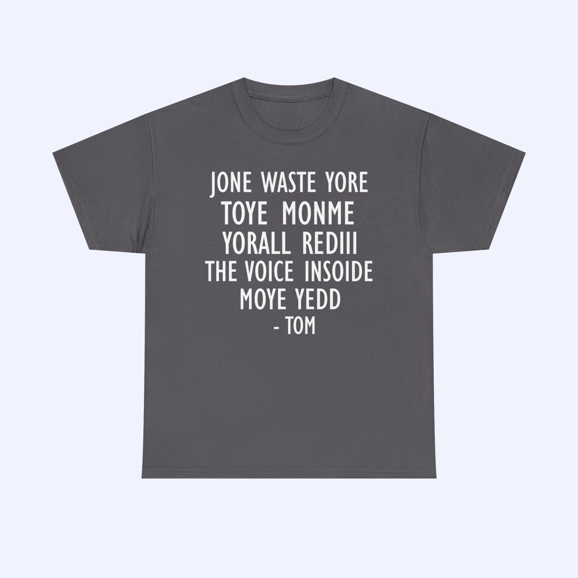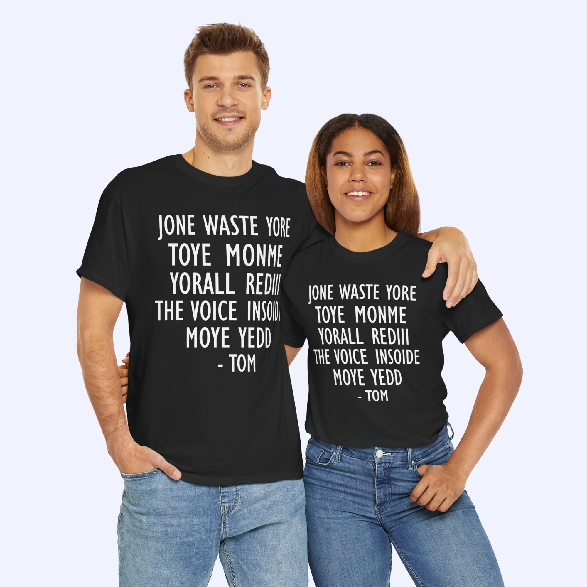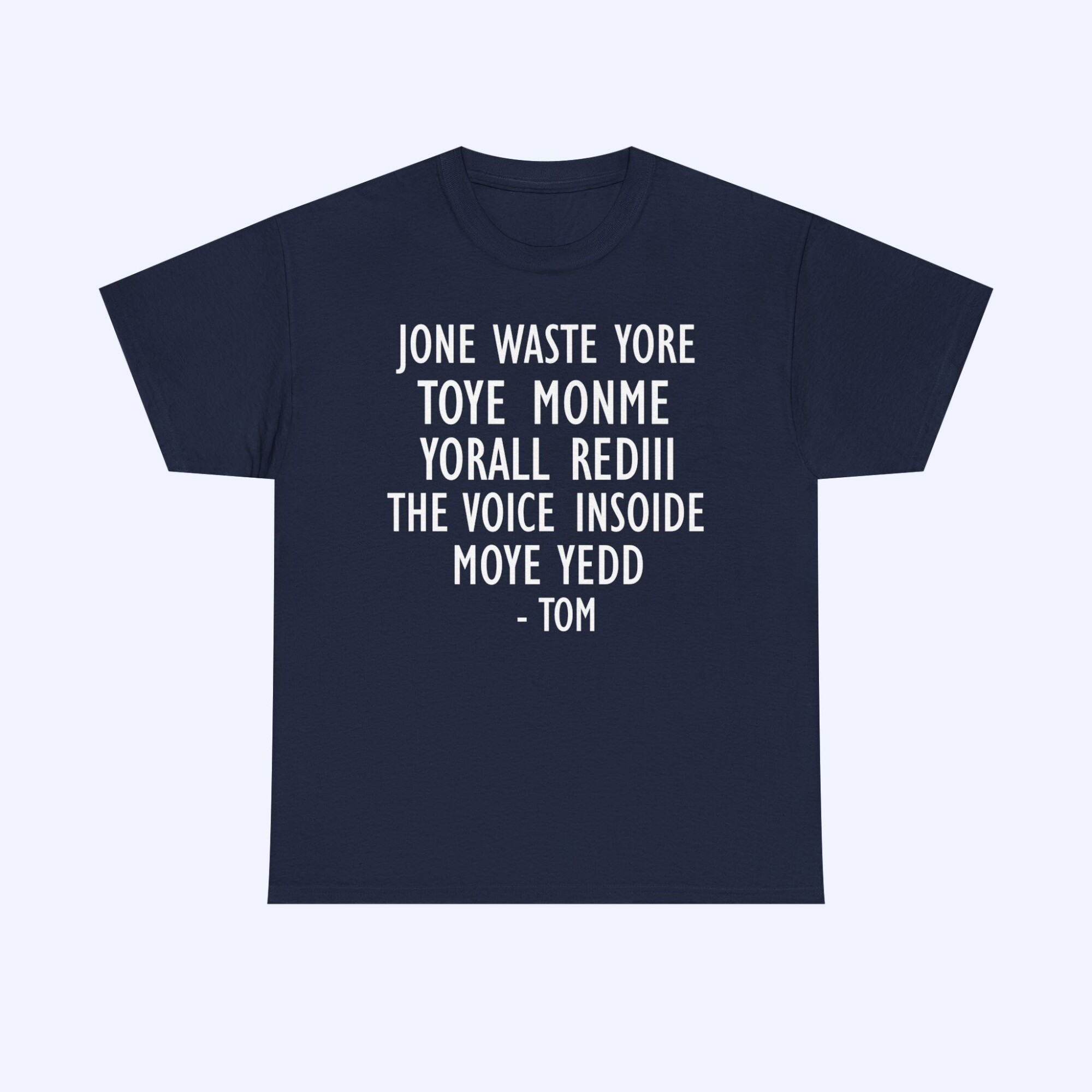 The Jone Waste Yore Toye Monme Shirt is pure internet legend. It turns Blink-182’s emotional lyric “Don’t waste your time on me, you’re already the voice inside my head” into a hilarious misheard meme. The phonetic version — “Jone Waste Yore Toye Monme Yorall Rediii The Voice Insoide Moye Yedd” — took over social media for being so perfectly wrong it became right.