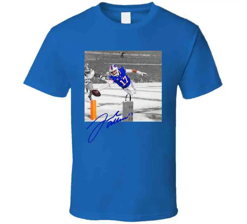 - Graphic/print details: Eye-catching design featuring Josh Allen’s iconic plays.