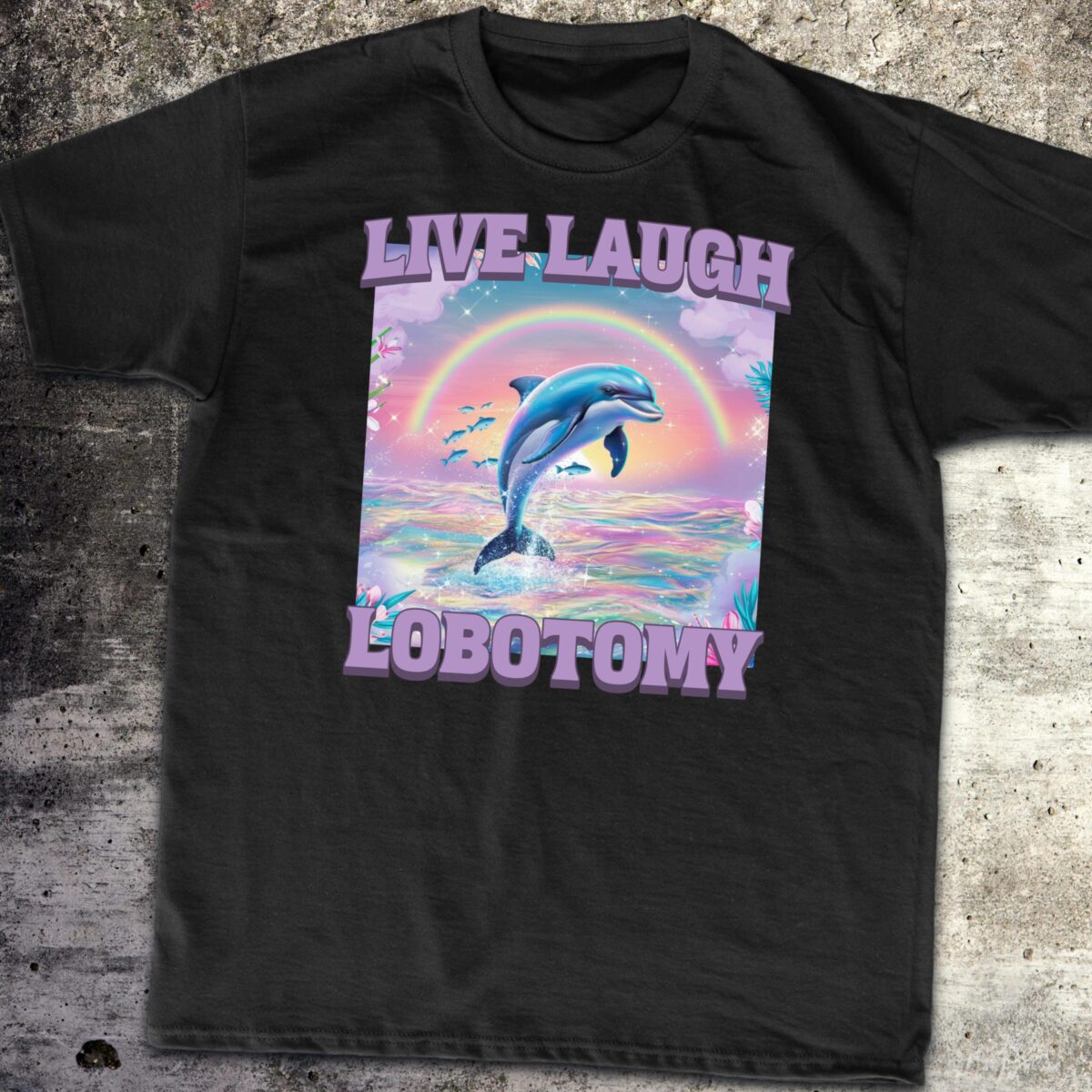 Introducing the Live Laugh Lobotomy Funny Dolphin Meme T-Shirt! This silly unisex graphic tee features a vibrant 90s-inspired dolphin design paired with the quirky phrase “Live Laugh Lobotomy.” Plus, it’s made from soft, breathable cotton for all-day comfort. Perfect for casual outings or as a unique gift for friends who love humor and retro style. Embrace your fun side with this one-of-a-kind shirt!