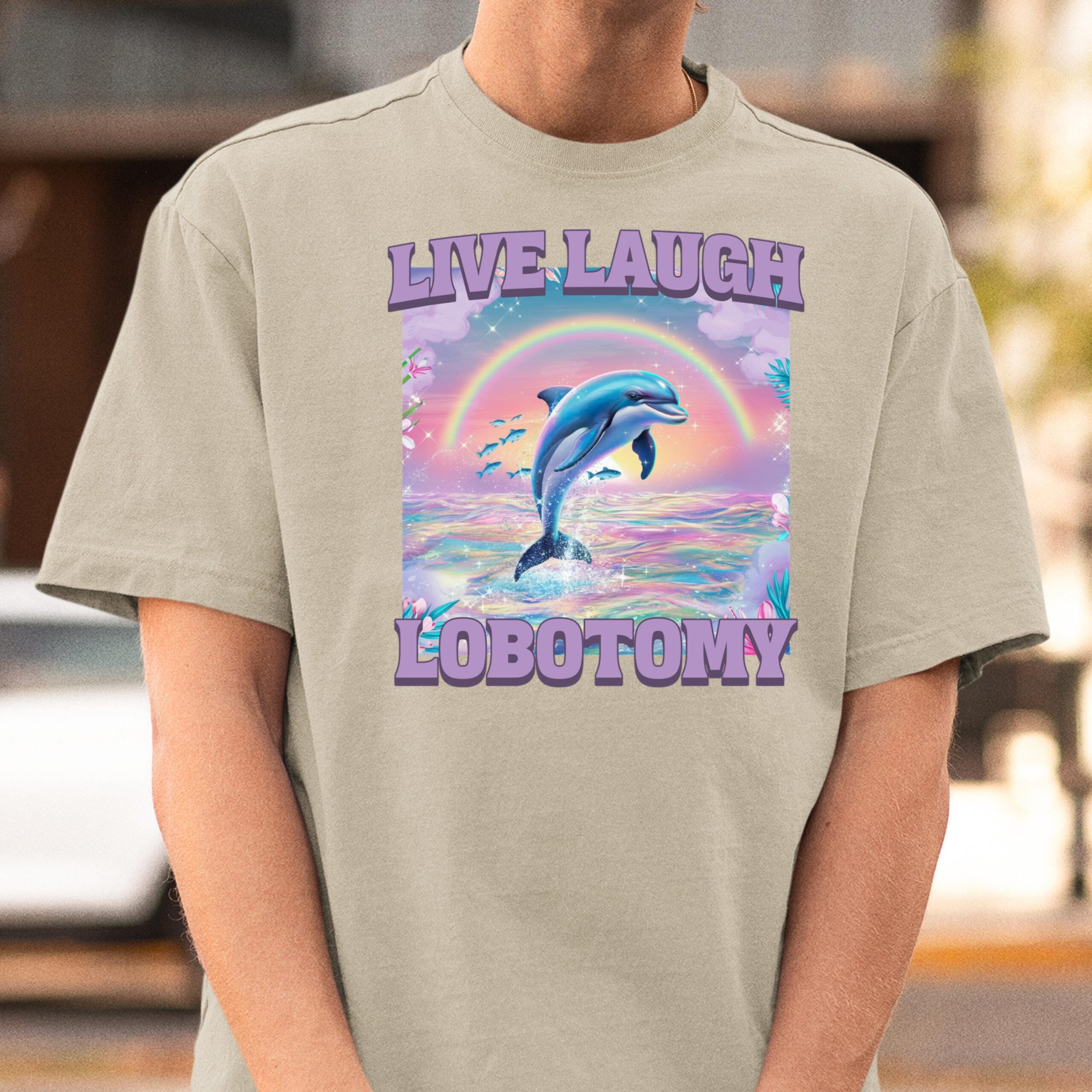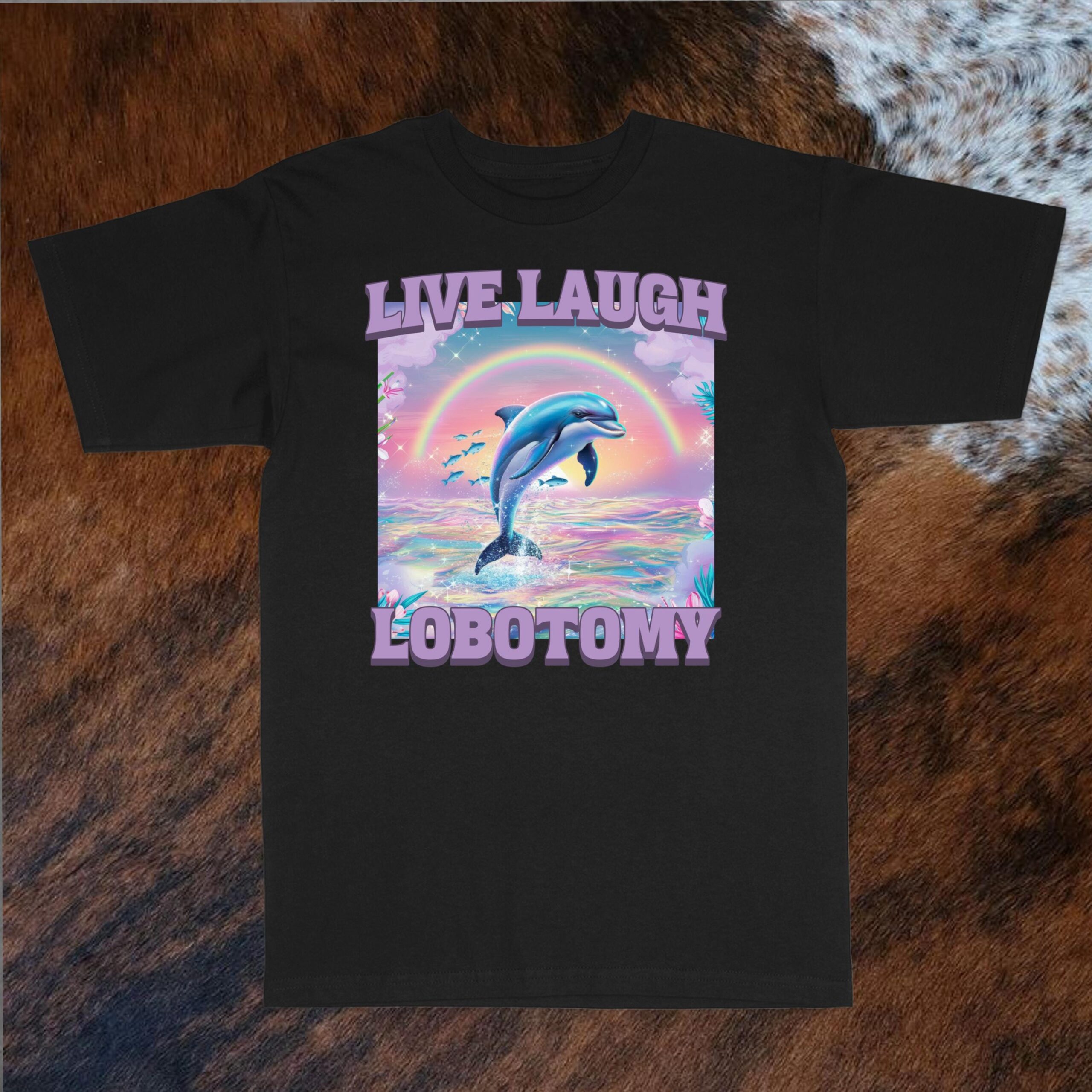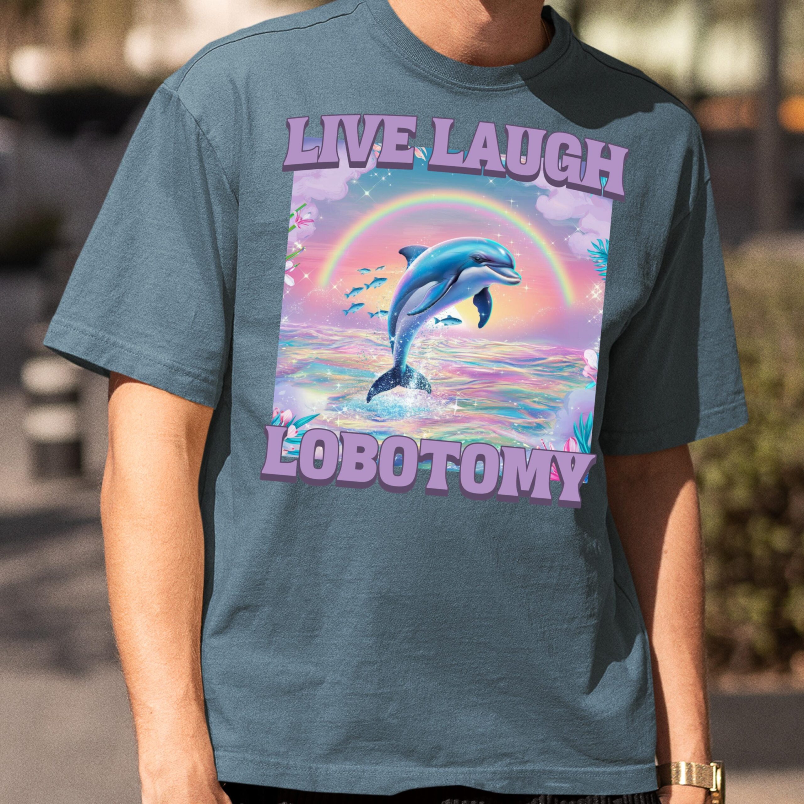 - Graphic/print details: Fun, retro dolphin graphic combined with the hilarious “Live Laugh Lobotomy” text.