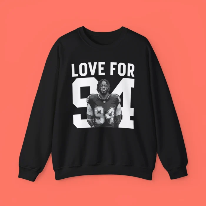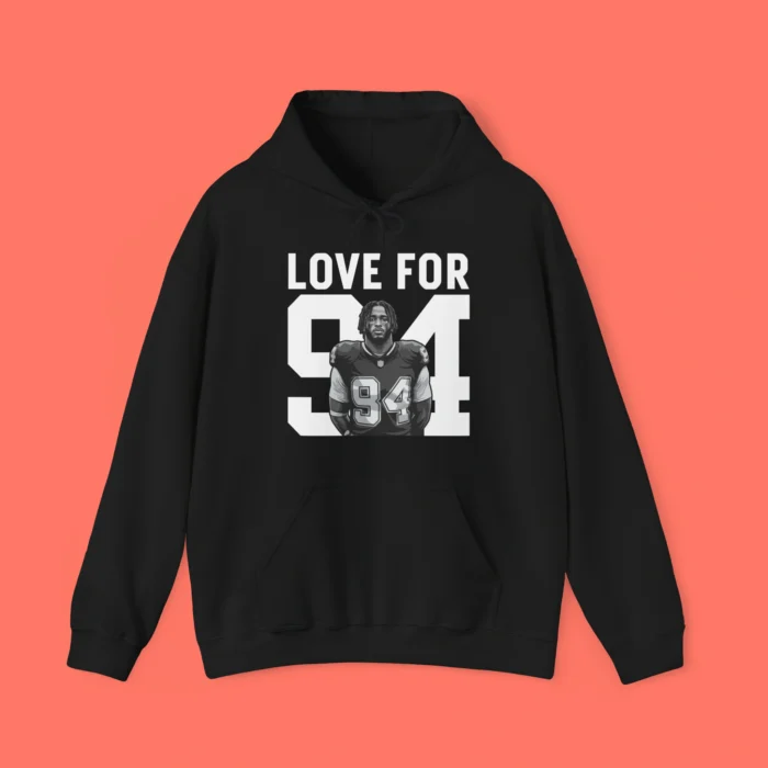 The design of the Love For 94 Marshawn Kneeland Shirt instantly captures attention with its bold visuals. The phrase “Love For” boldly sits at the top in uppercase letters, leading to a striking representation of the number 94 below it. This number stands out in bright white against the deep black fabric, making it impossible to overlook. Moreover, the shirt features an artistic portrait inspired by Marshawn Kneeland, showcasing his spirit and strength with smooth shading and defined outlines that breathe life into the design.