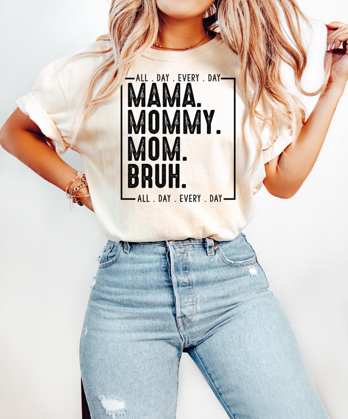 Moreover, the Mama Mommy Mom Bruh Sweatshirt is designed to be versatile. Pair it with your favorite jeans for a relaxed look or dress it up with a stylish skirt for a fun outing. Whatever the occasion, this sweatshirt is sure to become a staple in your everyday collection.