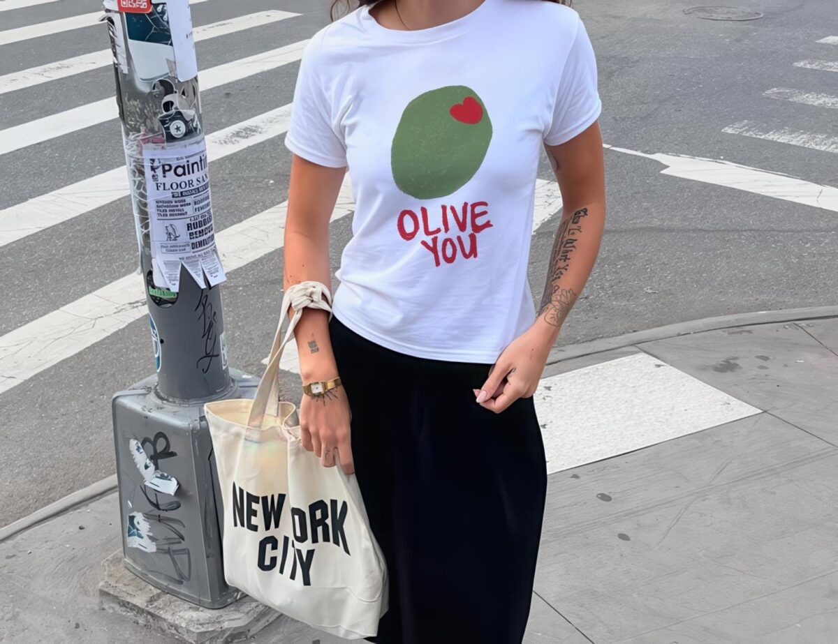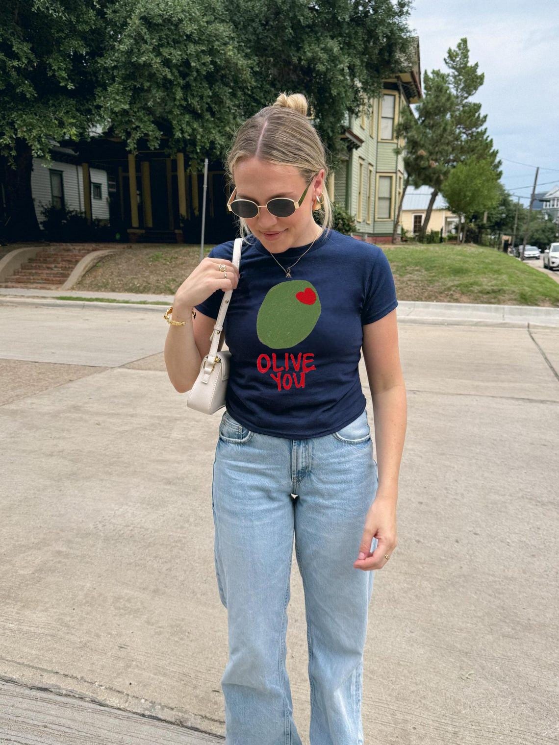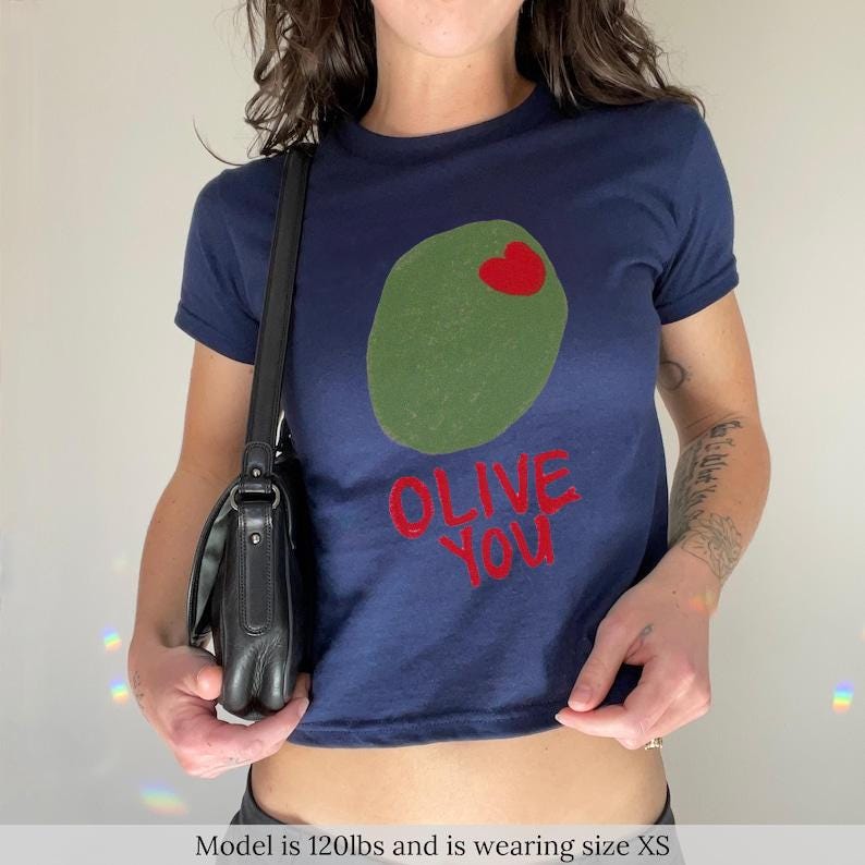 - Graphic/print details: Hand-drawn “olive you” design with a vibrant green olive.