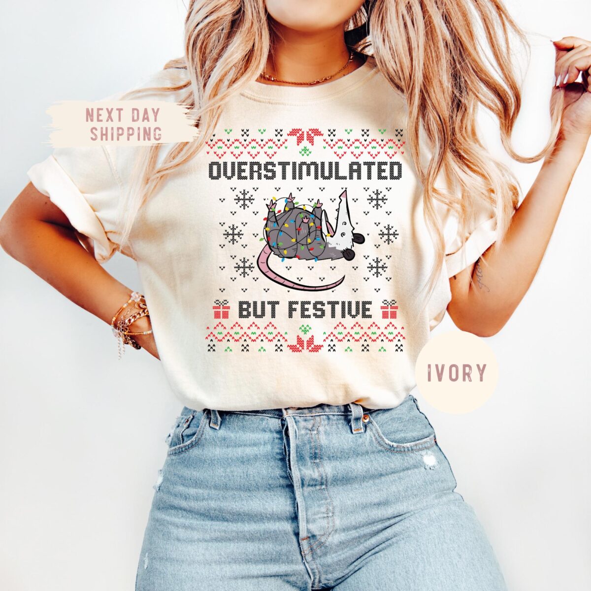 Overstimulated Festive Possum Christmas Shirt – Funny Holiday Tee