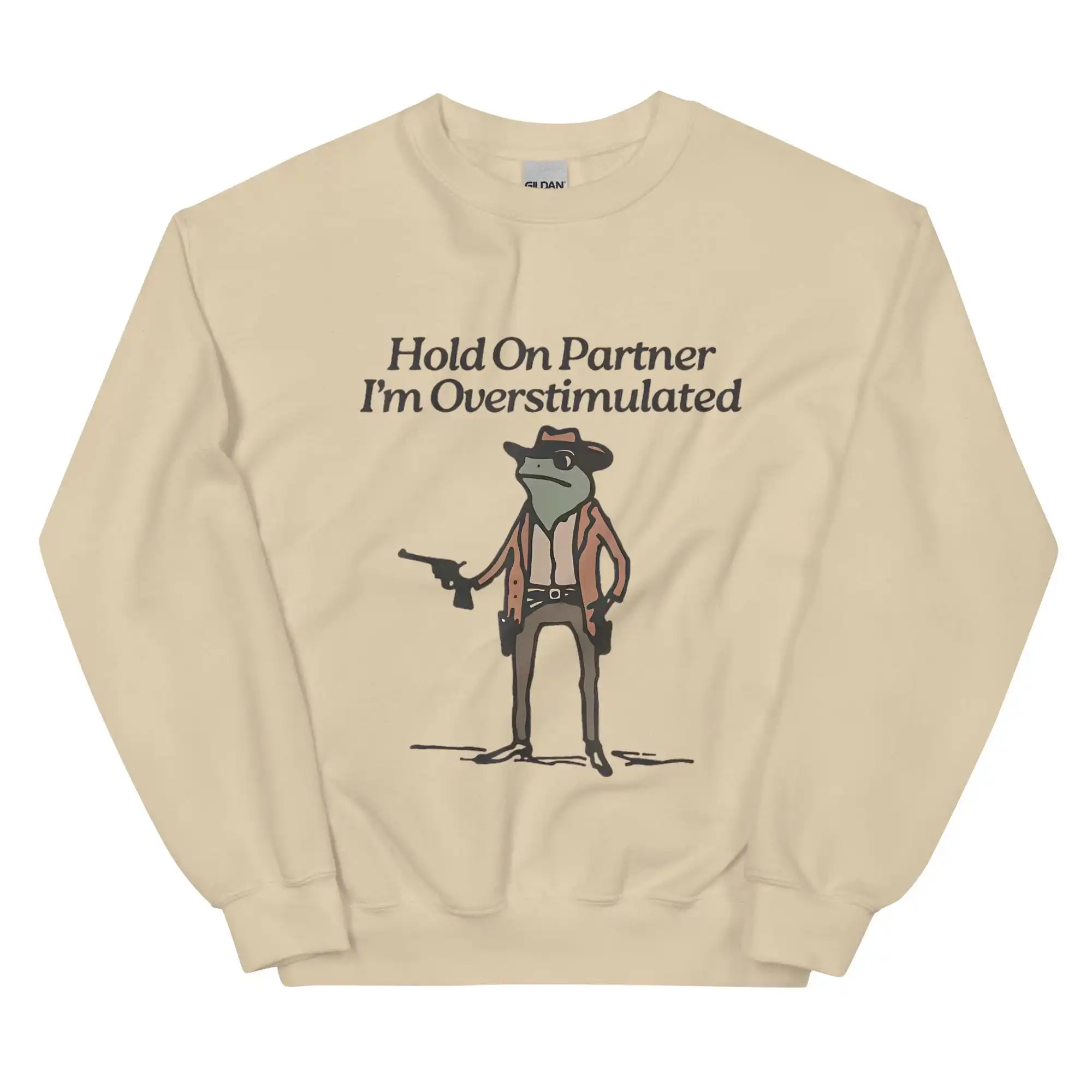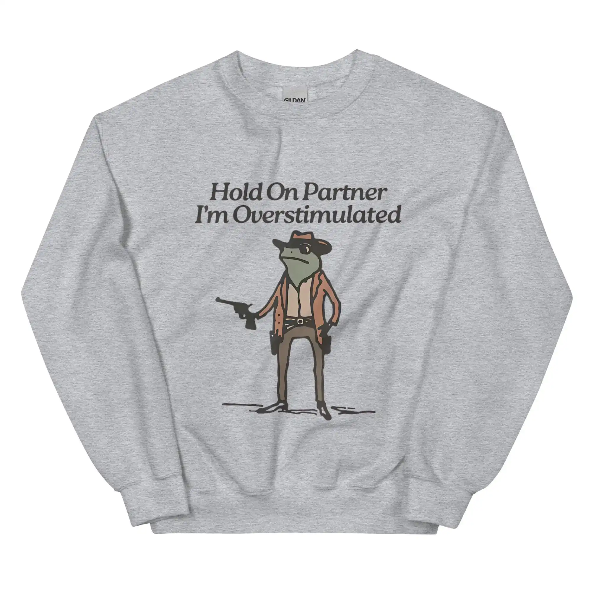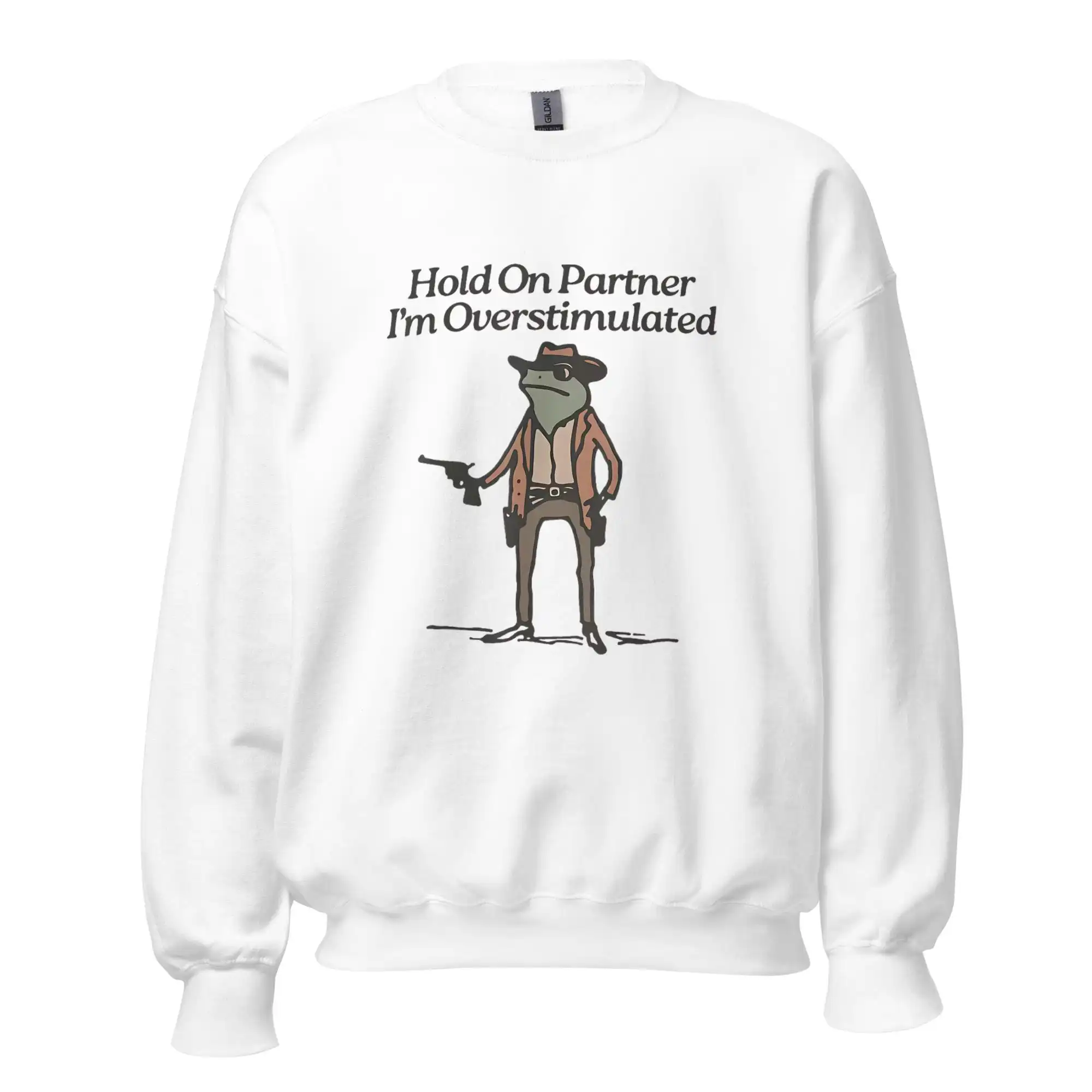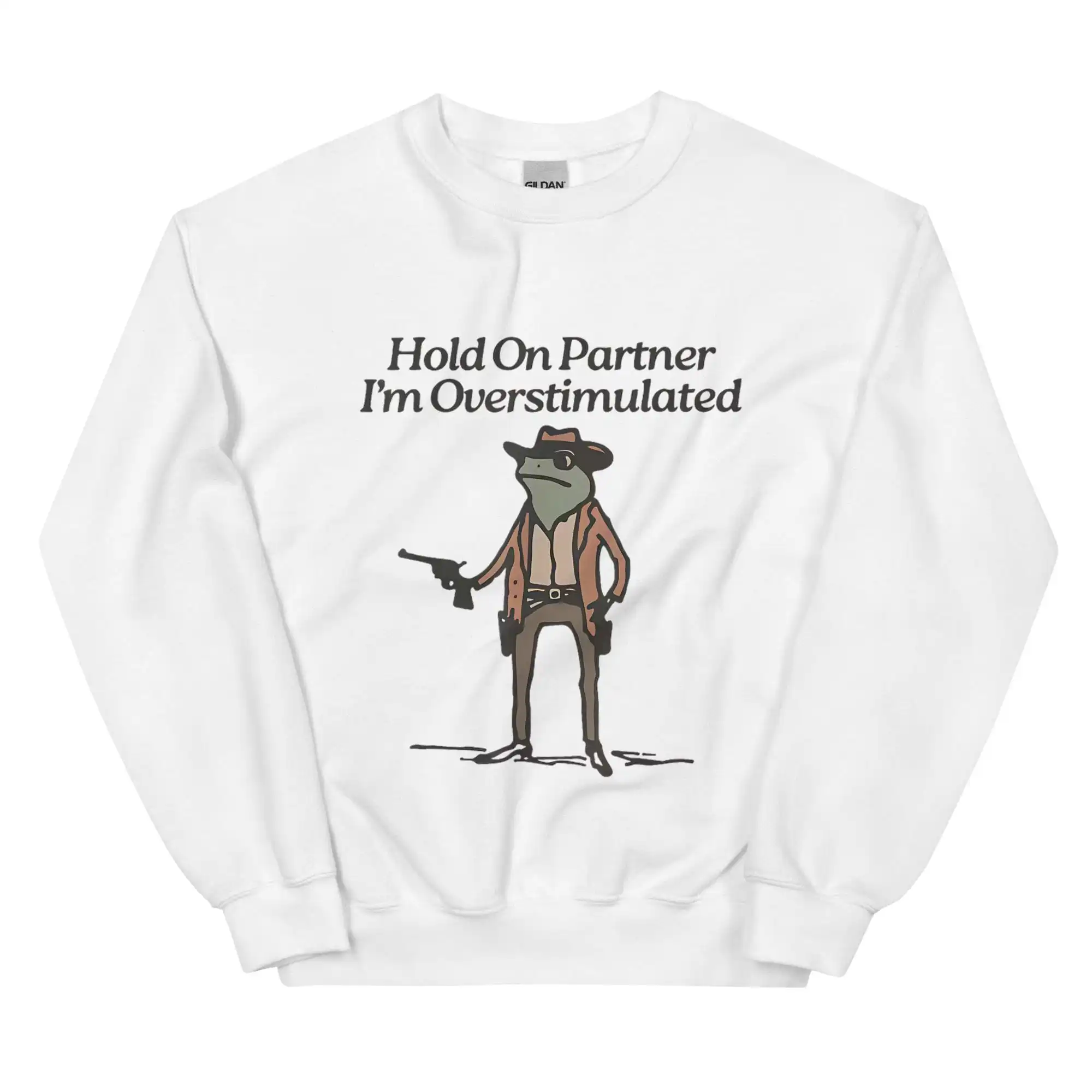 The Overstimulated Frog Sweatshirt is more than just a cozy pullover; it’s a statement. Featuring a whimsical frog graphic accompanied by the phrase “Hold On Partner, I’m Overstimulated,” this piece perfectly embodies that relatable sensation of sensory overload. Whether you’re navigating a bustling party or simply enjoying a quiet night at home, this sweatshirt is designed to keep you comfortable while also sparking conversations.