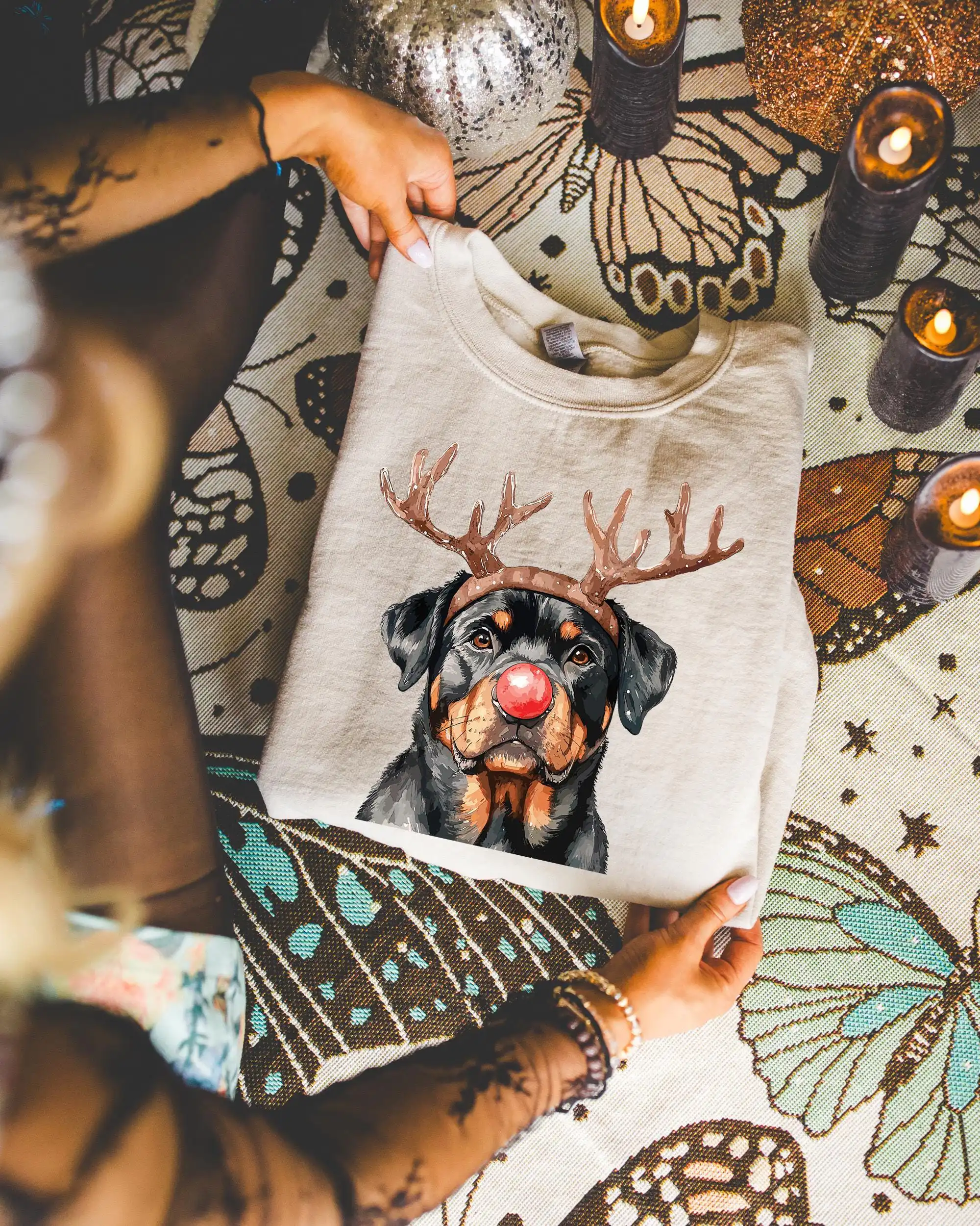 Embrace the festive spirit with our Rottweiler Christmas Sweatshirt: Dog Lover Holiday Crewneck. Perfect for dog lovers, this cozy sweatshirt combines holiday cheer with a passion for Rottweilers, making it a must-have for your winter wardrobe.
