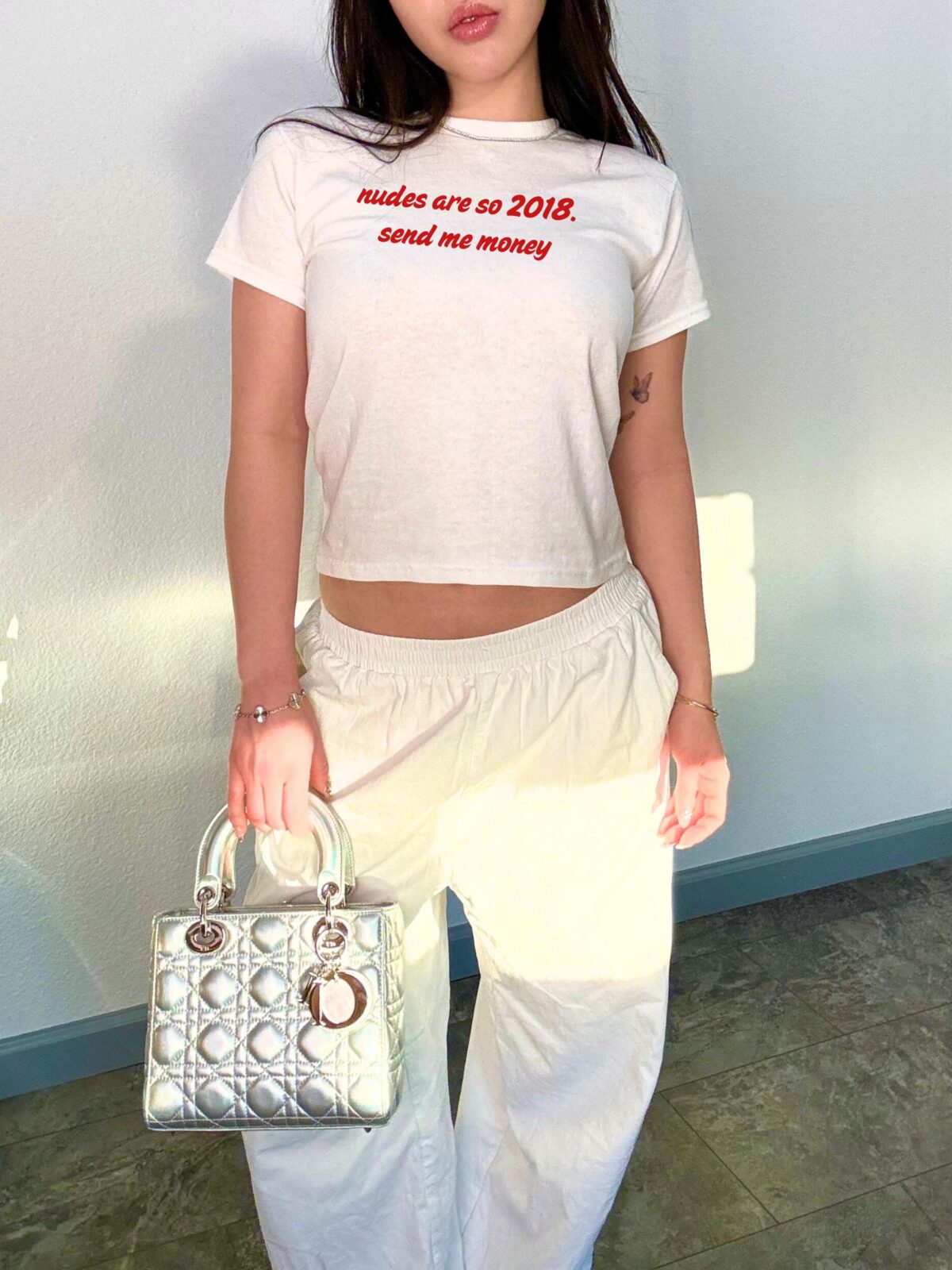 Additionally, the slightly see-through quality adds a touch of fun for those sunny days. The playful “send me money” slogan brings an element of cheekiness, making it not just a tee but a conversation starter. Whether for a casual day out or lounging at home, this tee embodies the carefree spirit of the Y2K era.