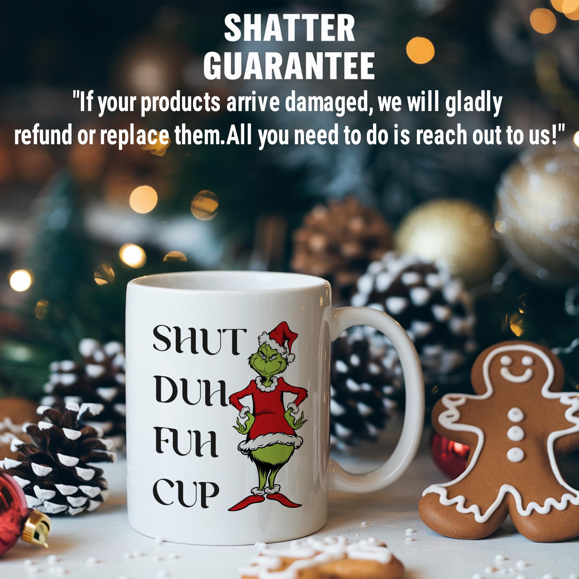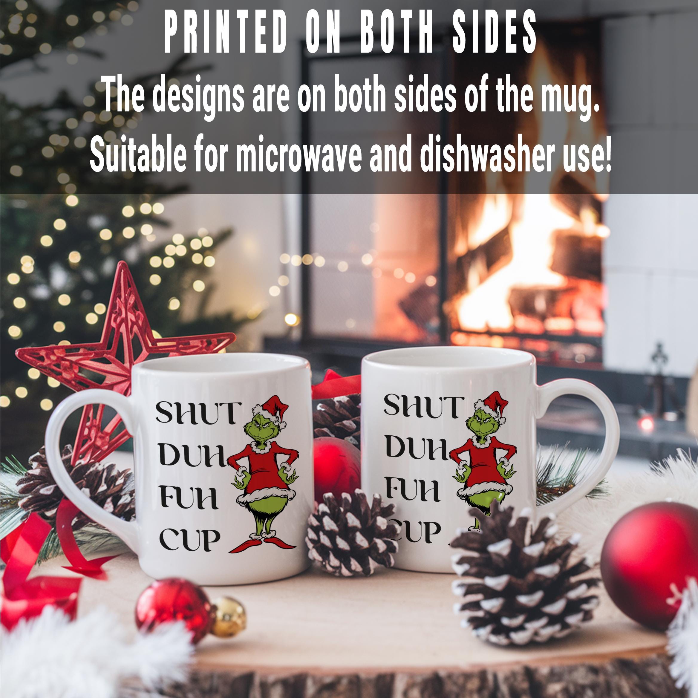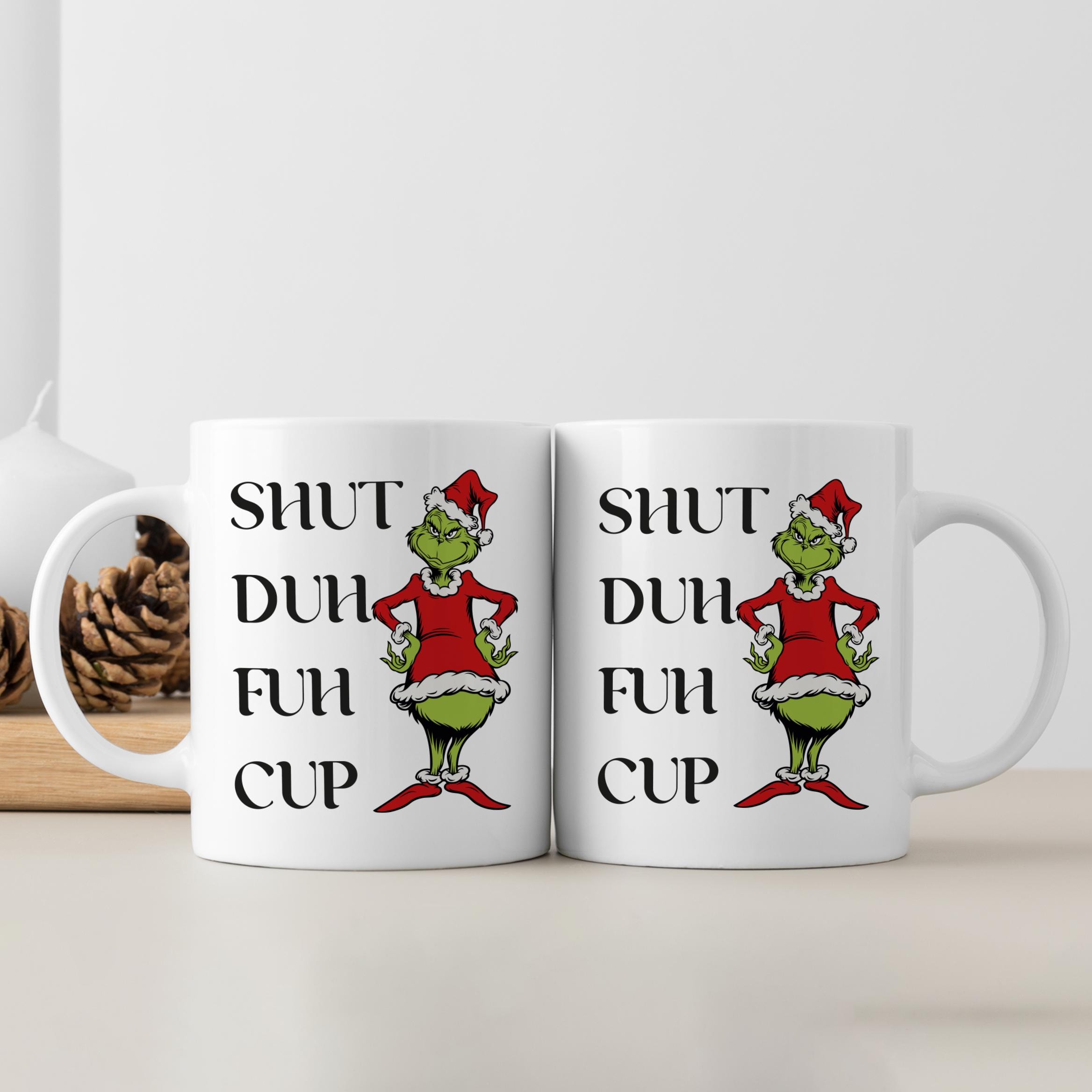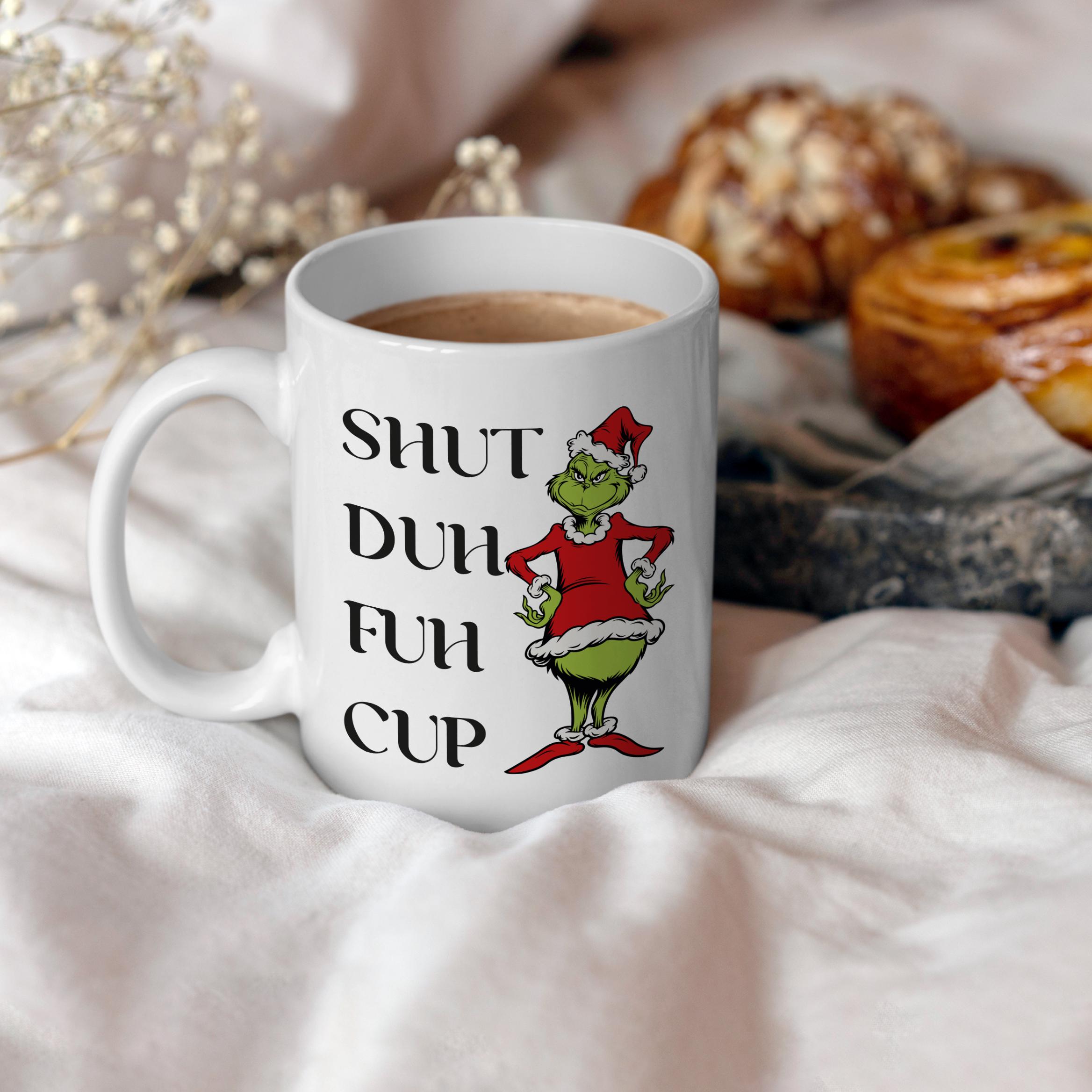 Get ready to bring a smile to your face with the Shut Duh Fuh Cup Mug, Funny Christmas Mug, Funny Holiday Gift, Christmas Coffee Mug, Christmas Gifts, Christmas Presents, Grinch Mug! This playful and eye-catching mug is the perfect blend of humor and holiday spirit, making it an ideal addition to your festive coffee break or a whimsical gift for those you love.
