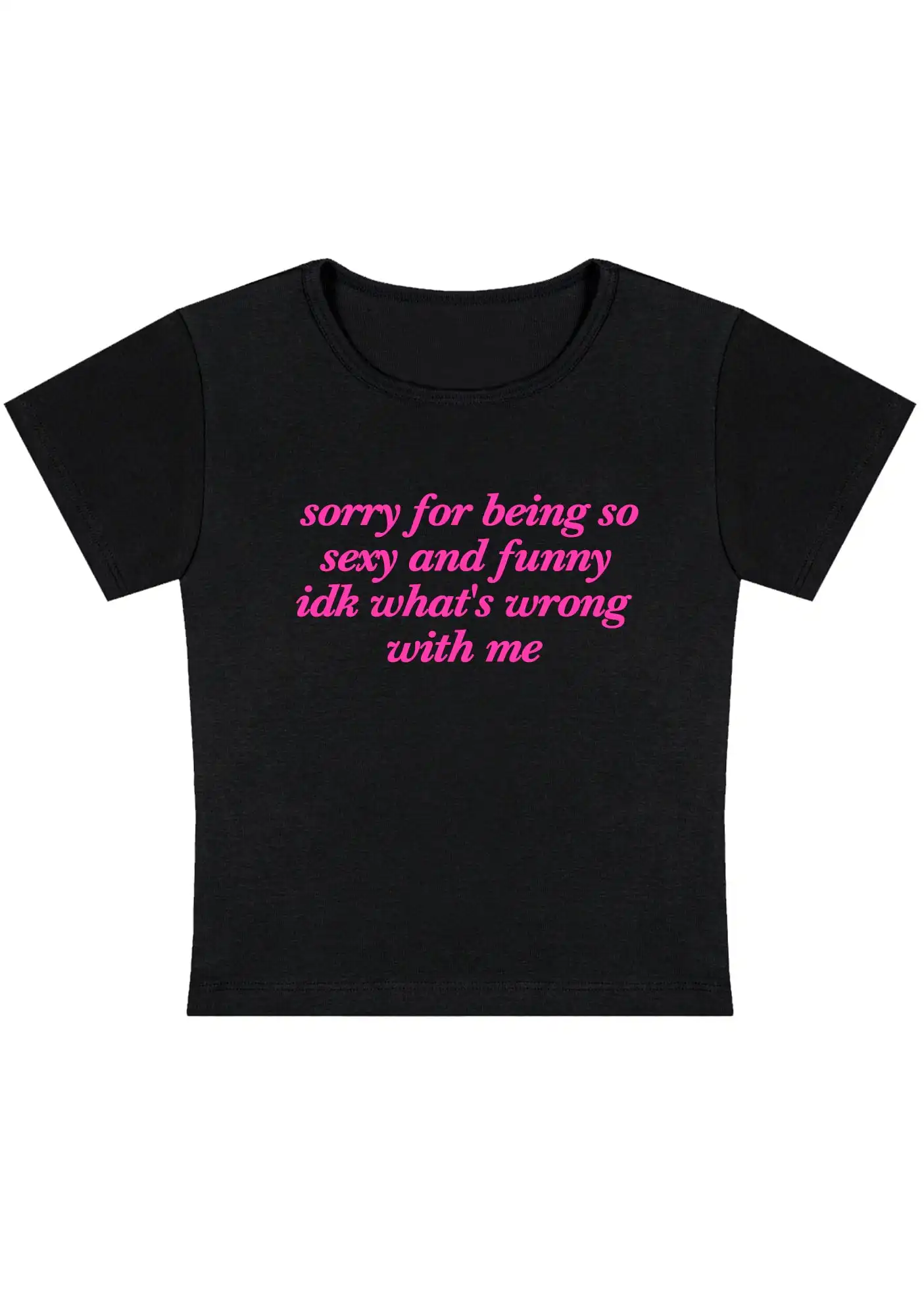 The Sorry For Being So Funny Y2K Baby Tee showcases a bold, lighthearted message that resonates with those who appreciate a good laugh. Its cropped length and fitted silhouette create a flattering look that pairs beautifully with high-waisted jeans, skirts, or shorts. Moreover, the retro-inspired design captures the essence of Y2K aesthetics, making it a must-have for fashion enthusiasts.