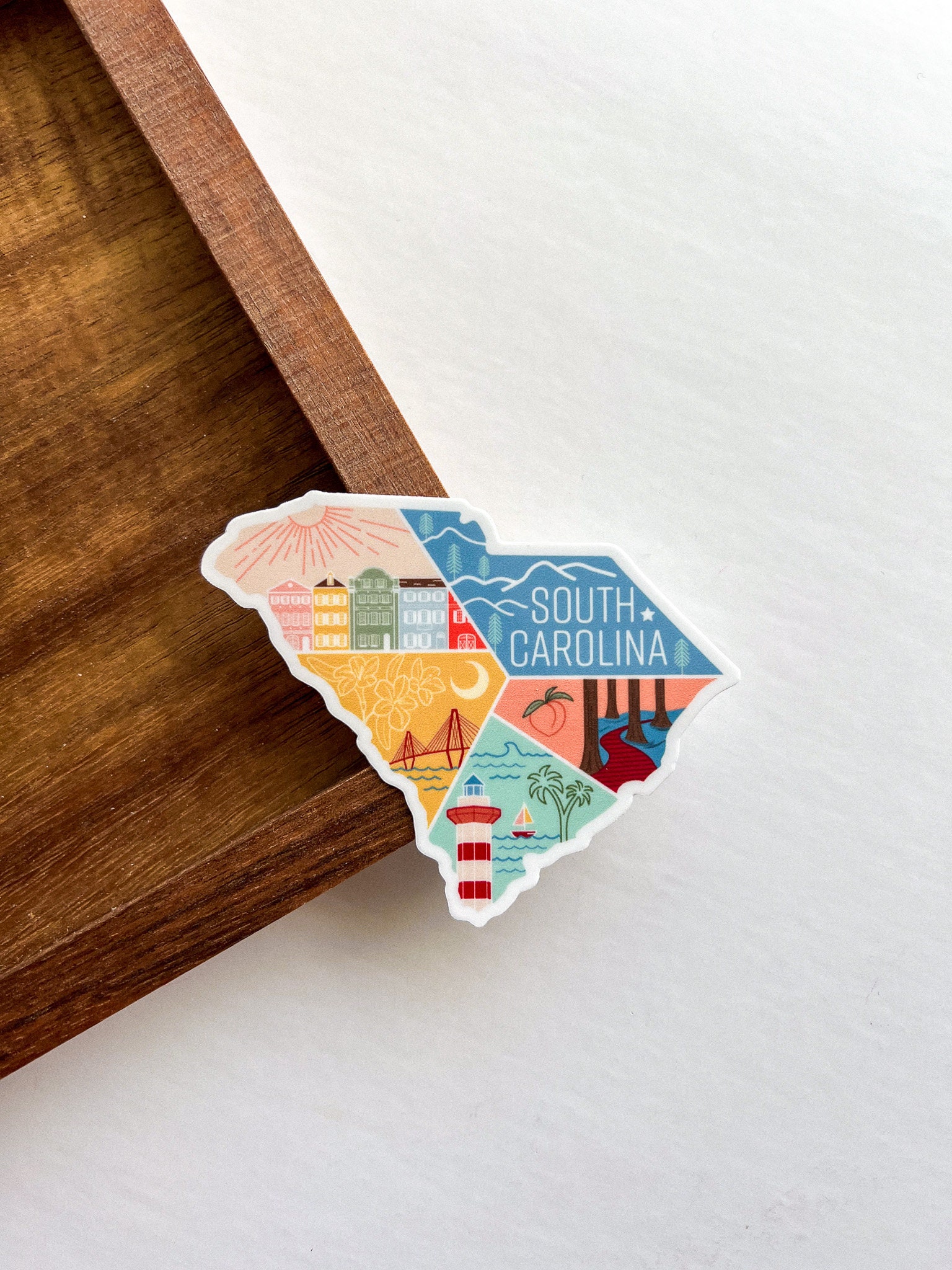 Show your love for the Palmetto State with the South Carolina Sticker | USA State Travel Souvenir Rainbow Row Blue Ridge Mountains Lighthouse Beach Ocean Peach National Park Weatherproof. This vibrant and versatile sticker perfectly captures the essence of South Carolina’s stunning landscapes and cultural highlights, making it a must-have for travel enthusiasts and locals alike.