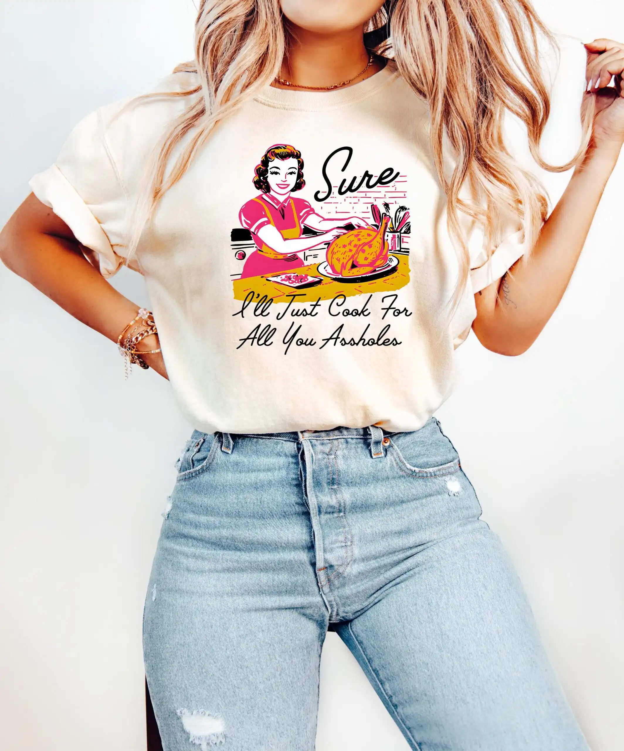 Get ready to embrace the holiday spirit with the Sure I’ll Just Cook For All You Asshole Lady Thanksgiving Sweatshirt! This funny Thanksgiving sweatshirt combines humor and comfort, making it perfect for gatherings with friends and family. Plus, its cozy fabric and eye-catching graphic will spark laughter while keeping you stylish. Whether you’re at Thanksgiving dinner or a Friendsgiving celebration, this playful tee is a must-have for your autumn wardrobe!
