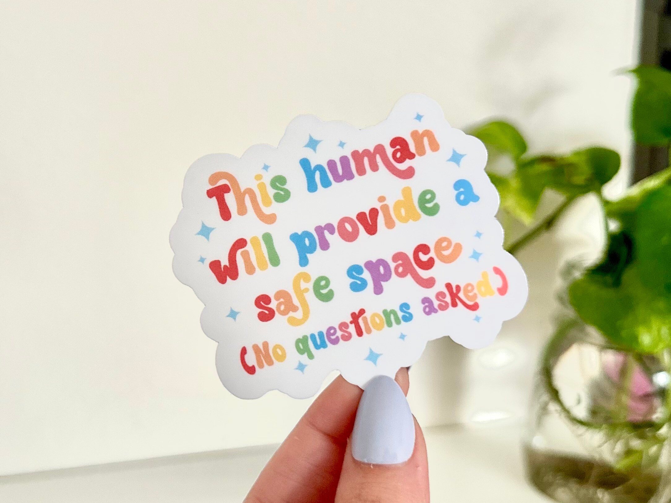 This Human Will Provide A Safe Space Waterproof Sticker – Inclusive Ally Decal for Waterbottles & Tumblers