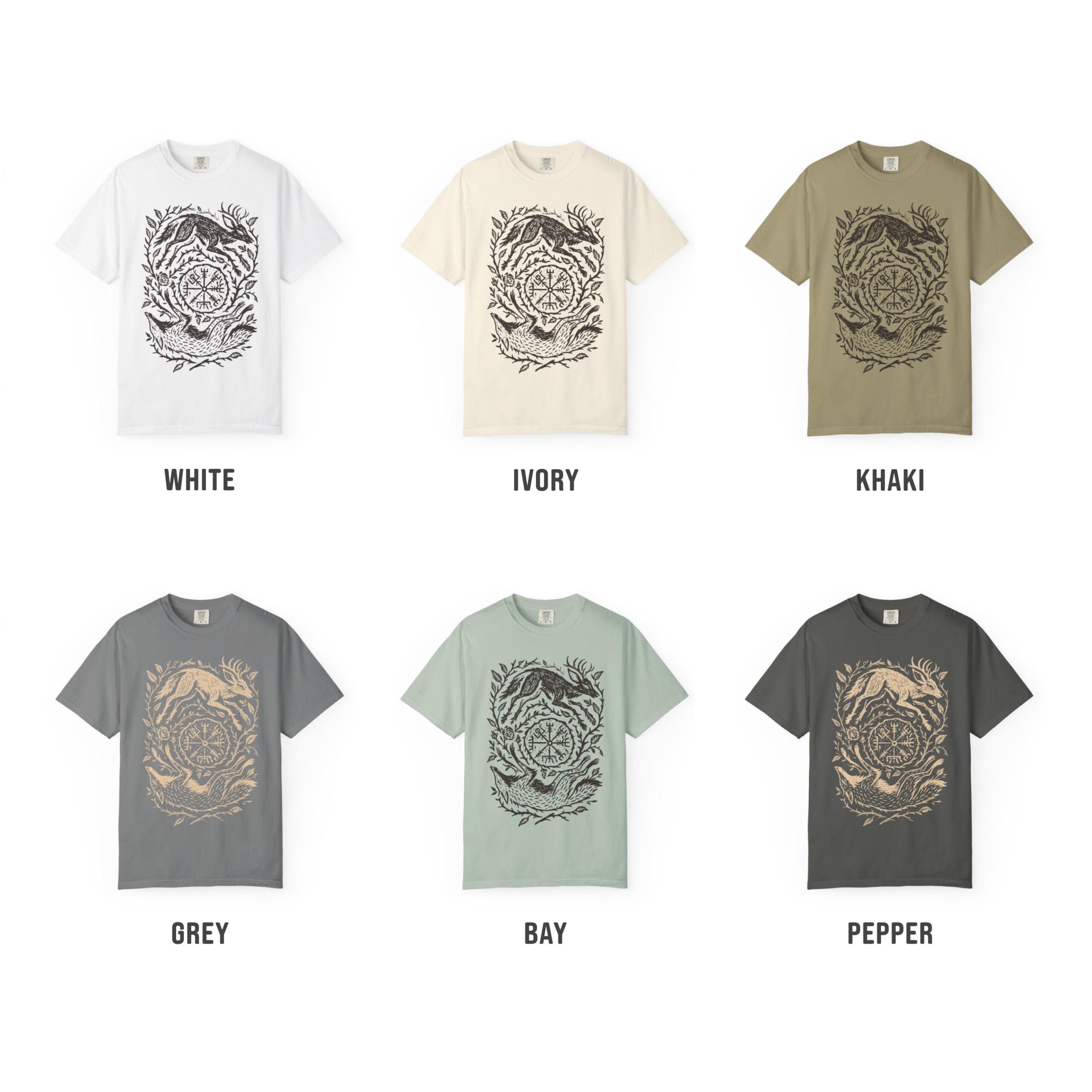 Discover the Wolf and Stag Linocut Shirt, a Norse Vegvisir Forest T-shirt that beautifully blends Viking folk art with a mystical yin yang animal design. Crafted from 100% ring-spun cotton, this tee offers ultimate comfort and a relaxed fit for everyone. Plus, its eye-catching graphic is perfect for sparking conversations and showcasing your unique style. Embrace nature and express your individuality with this stunning shirt that’s ideal for any occasion!